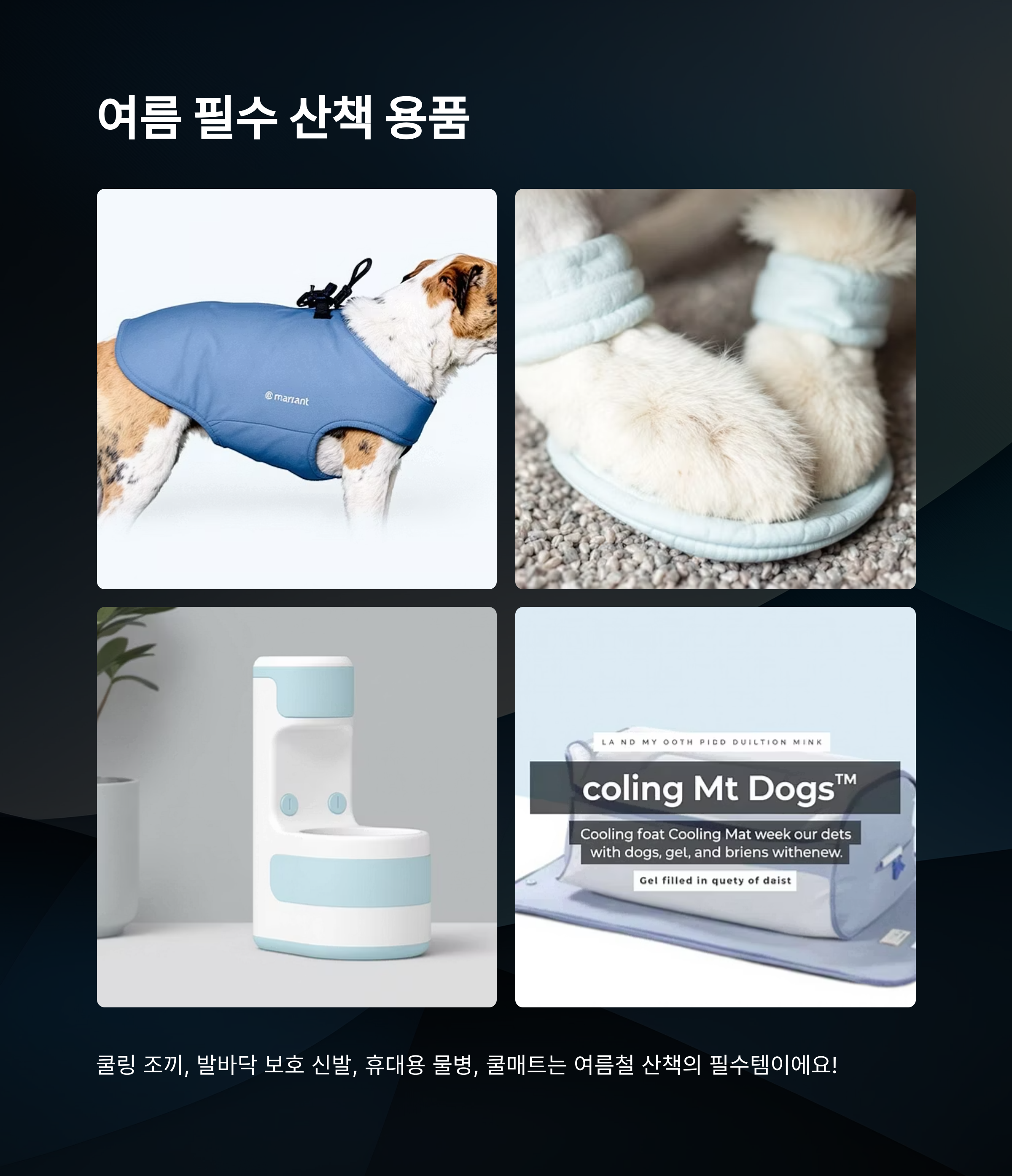 | 쿨 매트 | 산책 후 회복 | 지속적 시원함 제공 | 쿨펫, 아이스펫 |