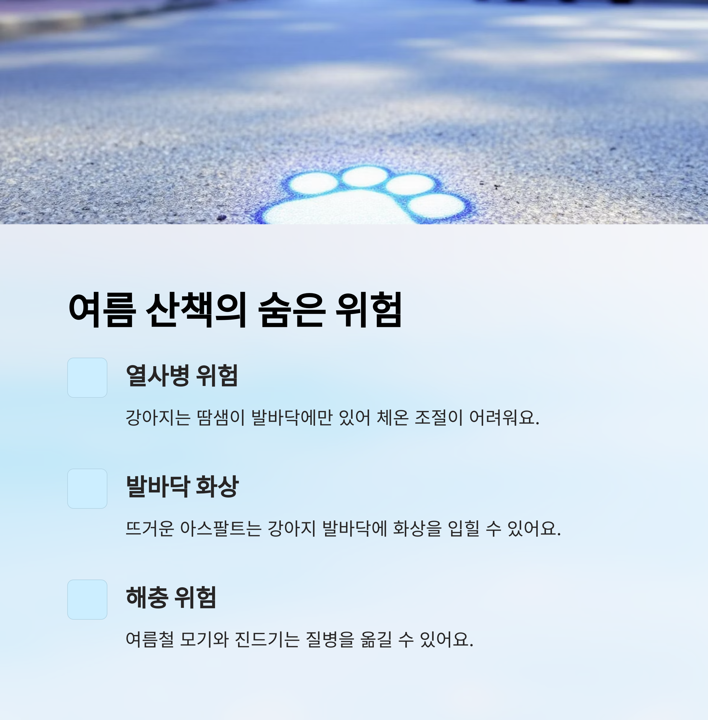 위에 정리된 것처럼, 여름 산책에는 여러 가지 위험이 도사리고 있어요. 하지만 이 요소들을 알고 잘 대비하면, 오히려 더 즐거운 산책이 될 수 있어요! 🐾