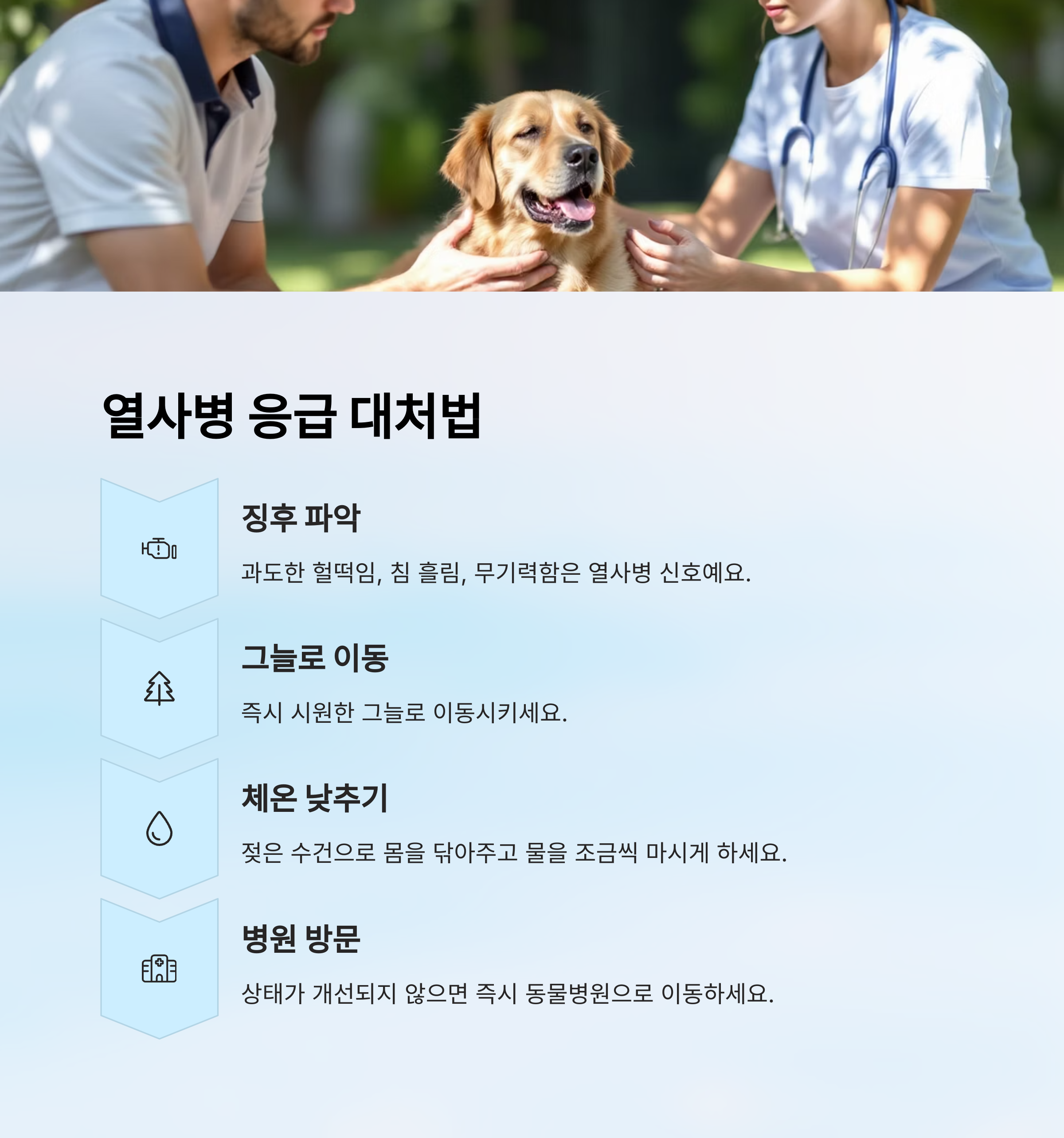 | 과도한 헐떡임 | 그늘 이동, 물 제공 | 경과 관찰 후 필요 |