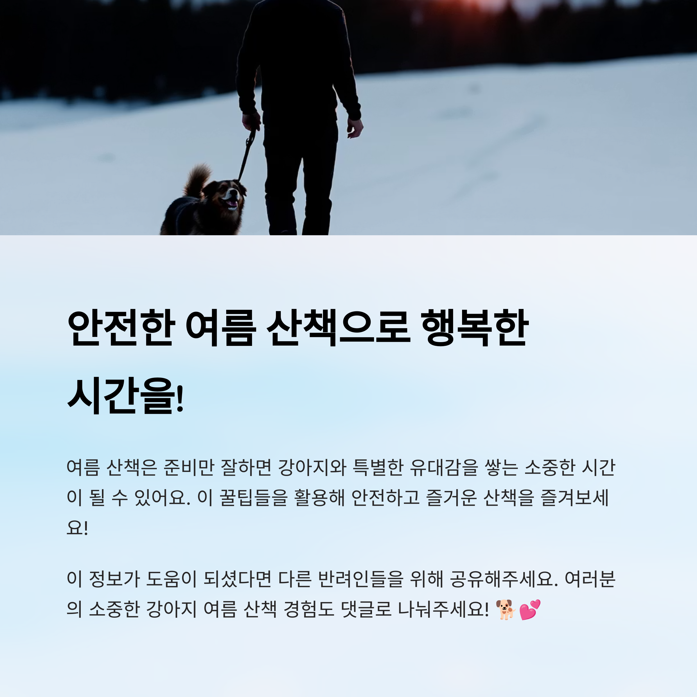 위에 정리된 것처럼, 여름 산책에는 여러 가지 위험이 도사리고 있어요. 하지만 이 요소들을 알고 잘 대비하면, 오히려 더 즐거운 산책이 될 수 있어요! 🐾