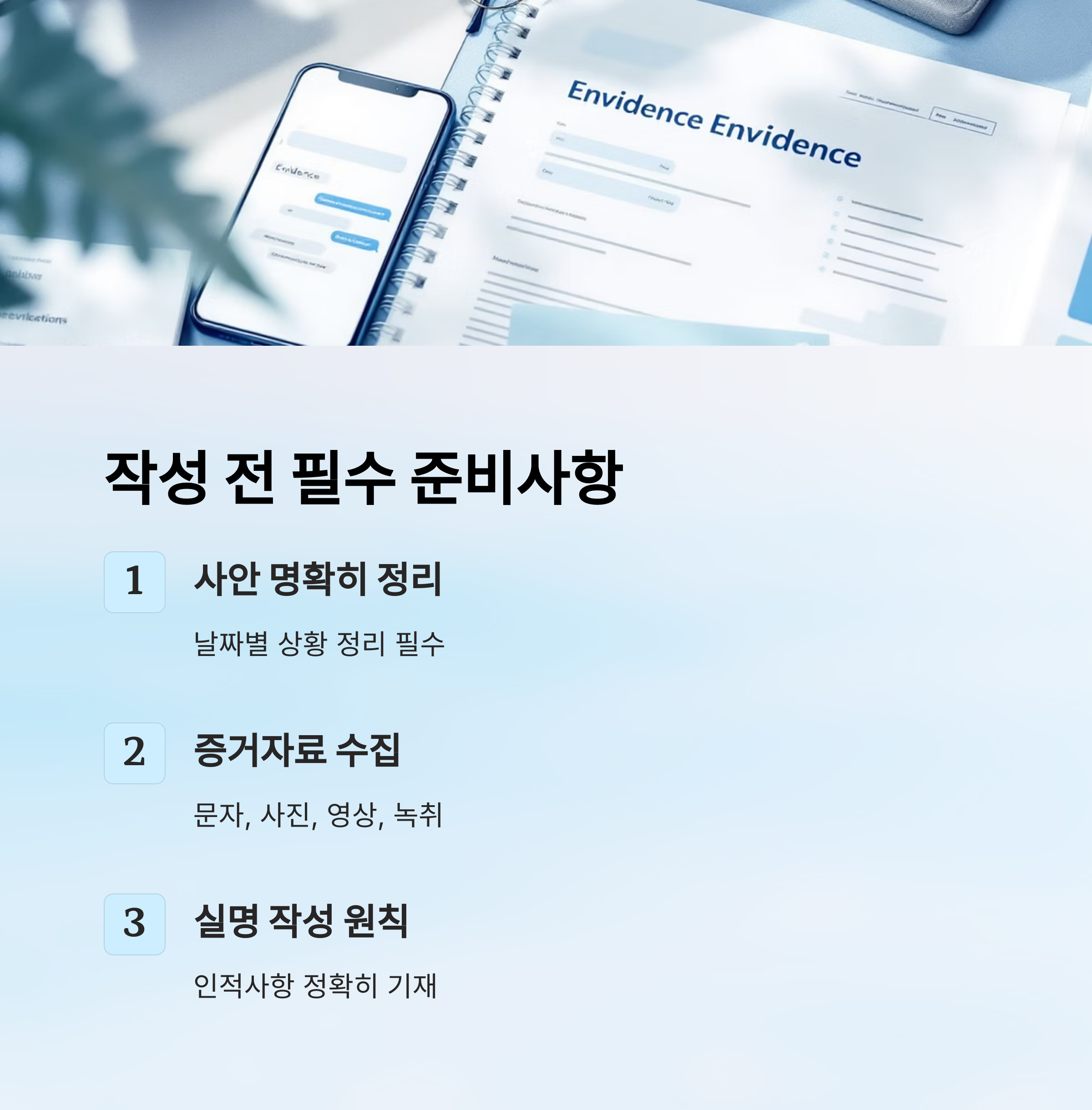 문장은 간결하게, 논리적으로 쓰는 게 핵심이에요. 감정적인 표현보다는 사실 위주로 정리하면 신뢰도가 높아지고, 조사 담당자가 이해하기도 훨씬 쉬워요.