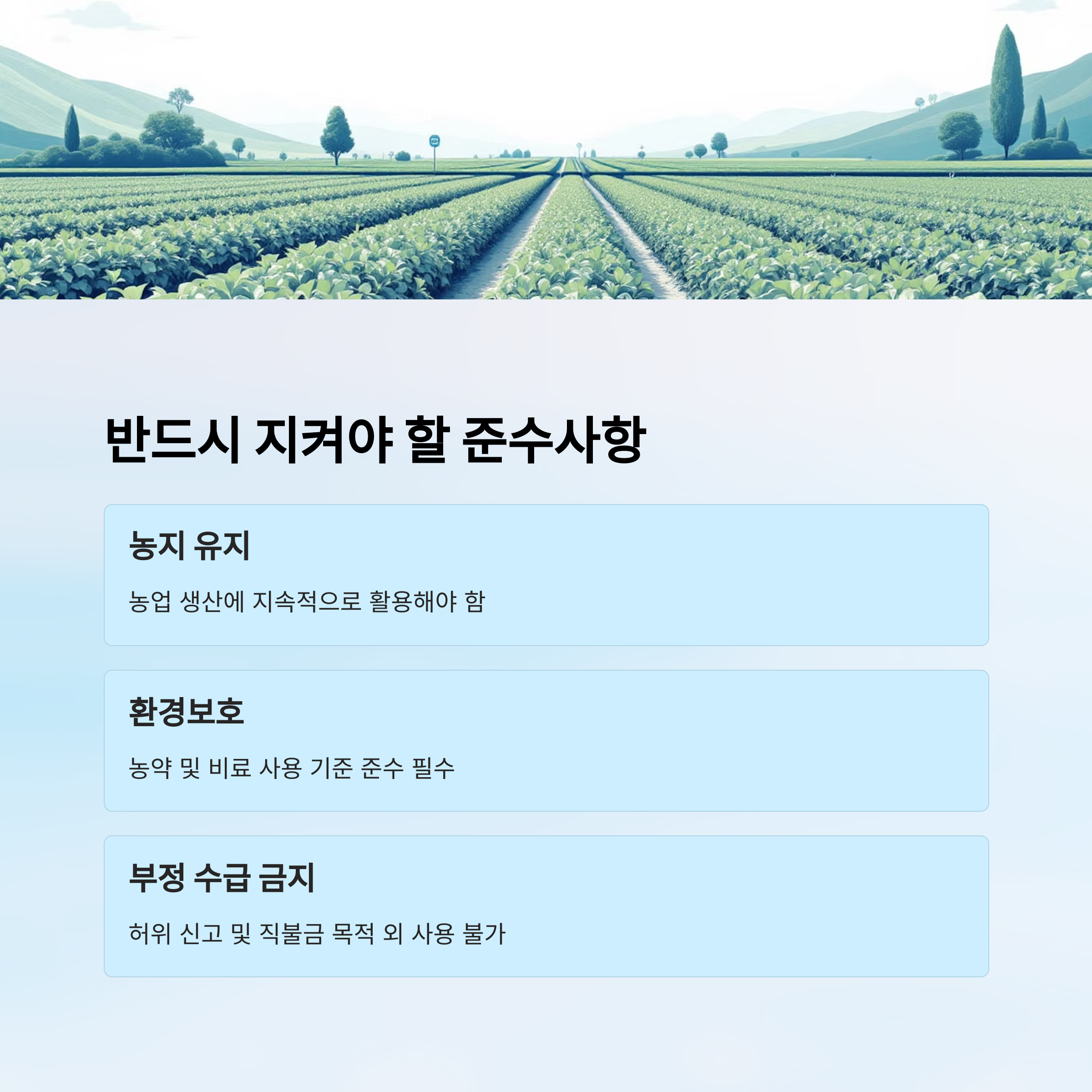 | 📜 준수사항 이행 | 농업 활동을 지속하며 공익적 의무 수행 |
