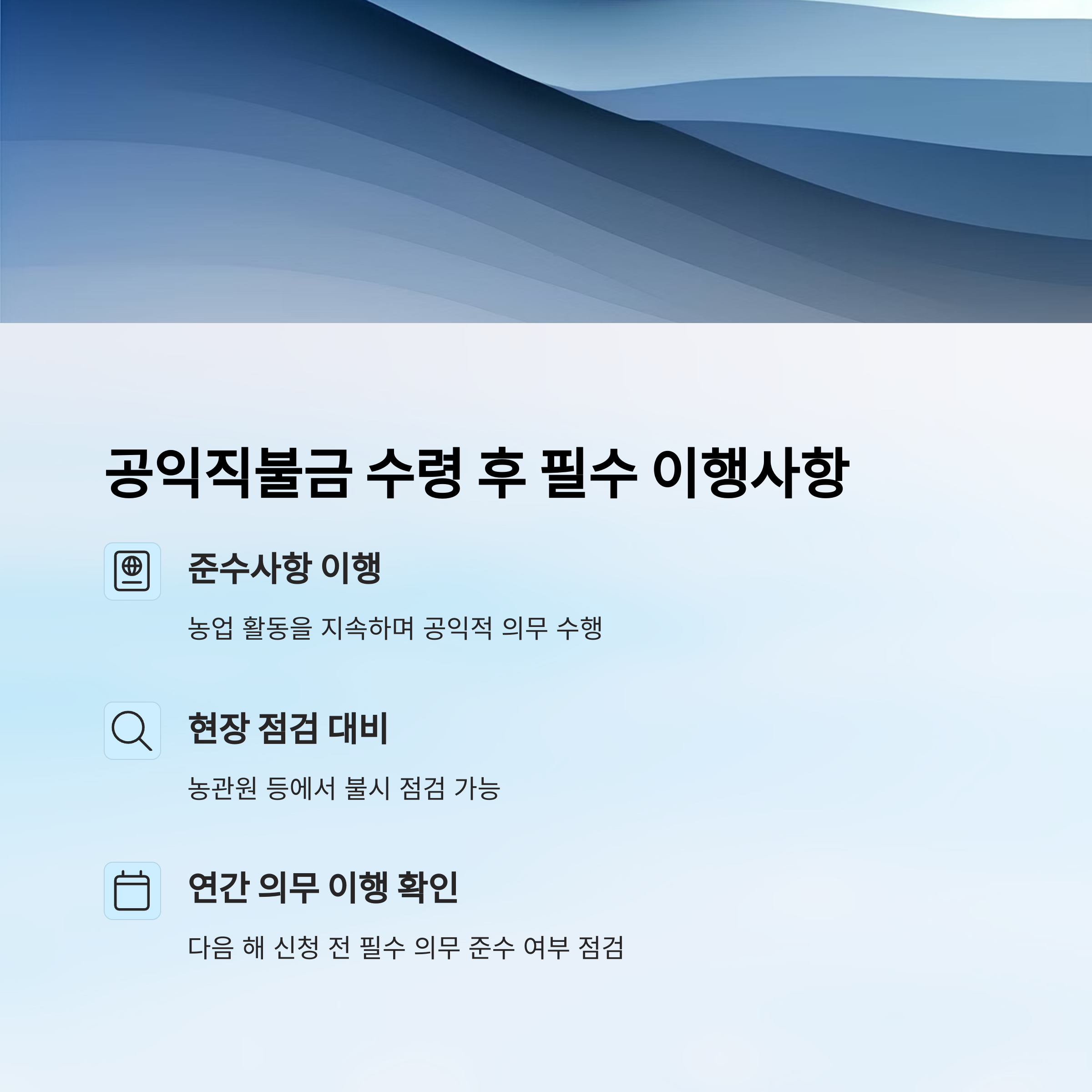 공익직불금을 수령한 후에는 반드시 지켜야 할 의무사항이 있어요. 이를 어길 경우 불이익이 발생할 수 있으니 주의해야 해요. 😲