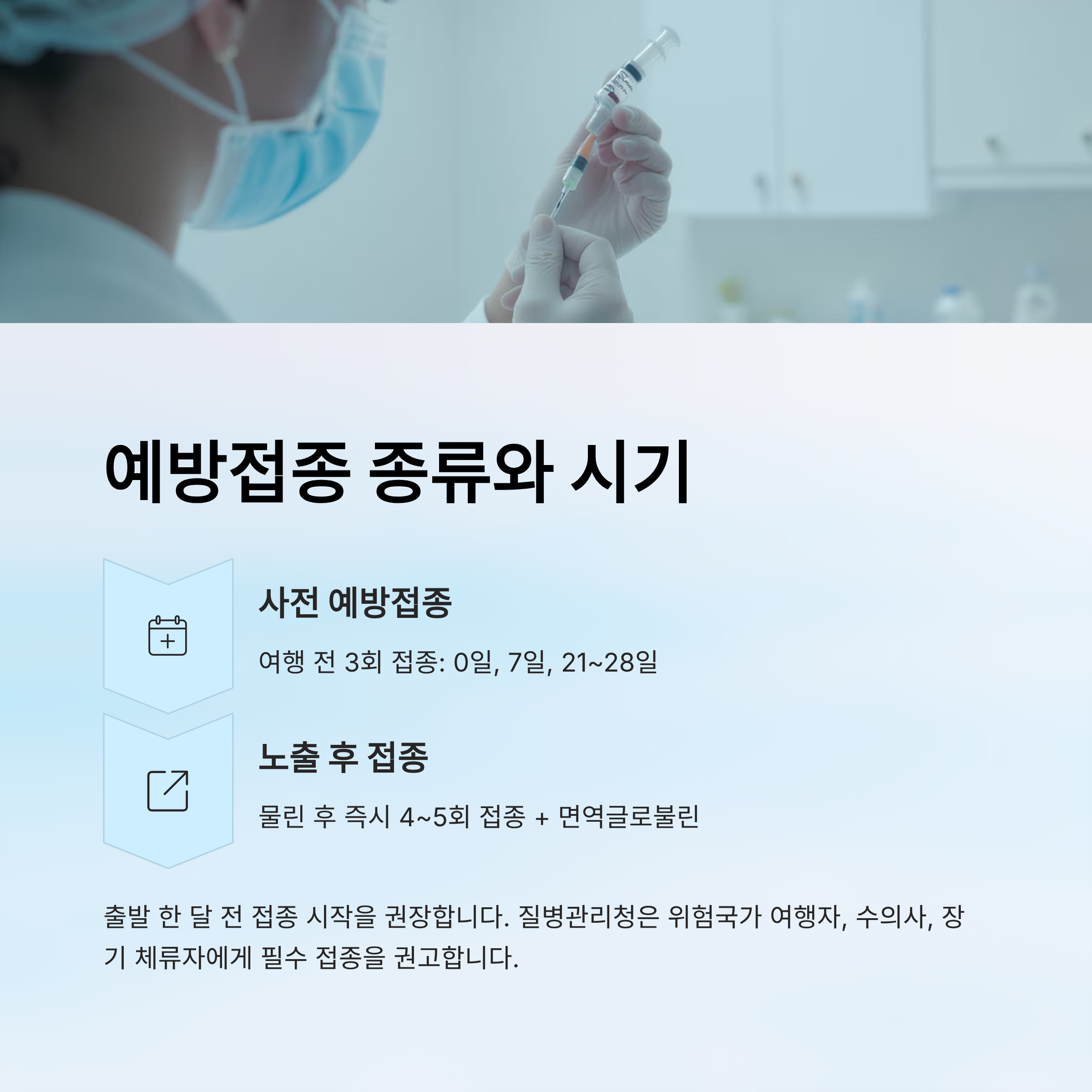 노출 후 접종은 감염이 의심될 때 즉시 시작해야 해요. 이때는 백신뿐 아니라 '면역글로불린(RIG)' 주사도 함께 맞아야 하는 경우가 많아요. 하지만 해외에서는 RIG 자체가 없는 병원도 많고, 비용도 굉장히 비싸서 한국에서 맞고 가는 게 훨씬 안전하고 경제적이에요.