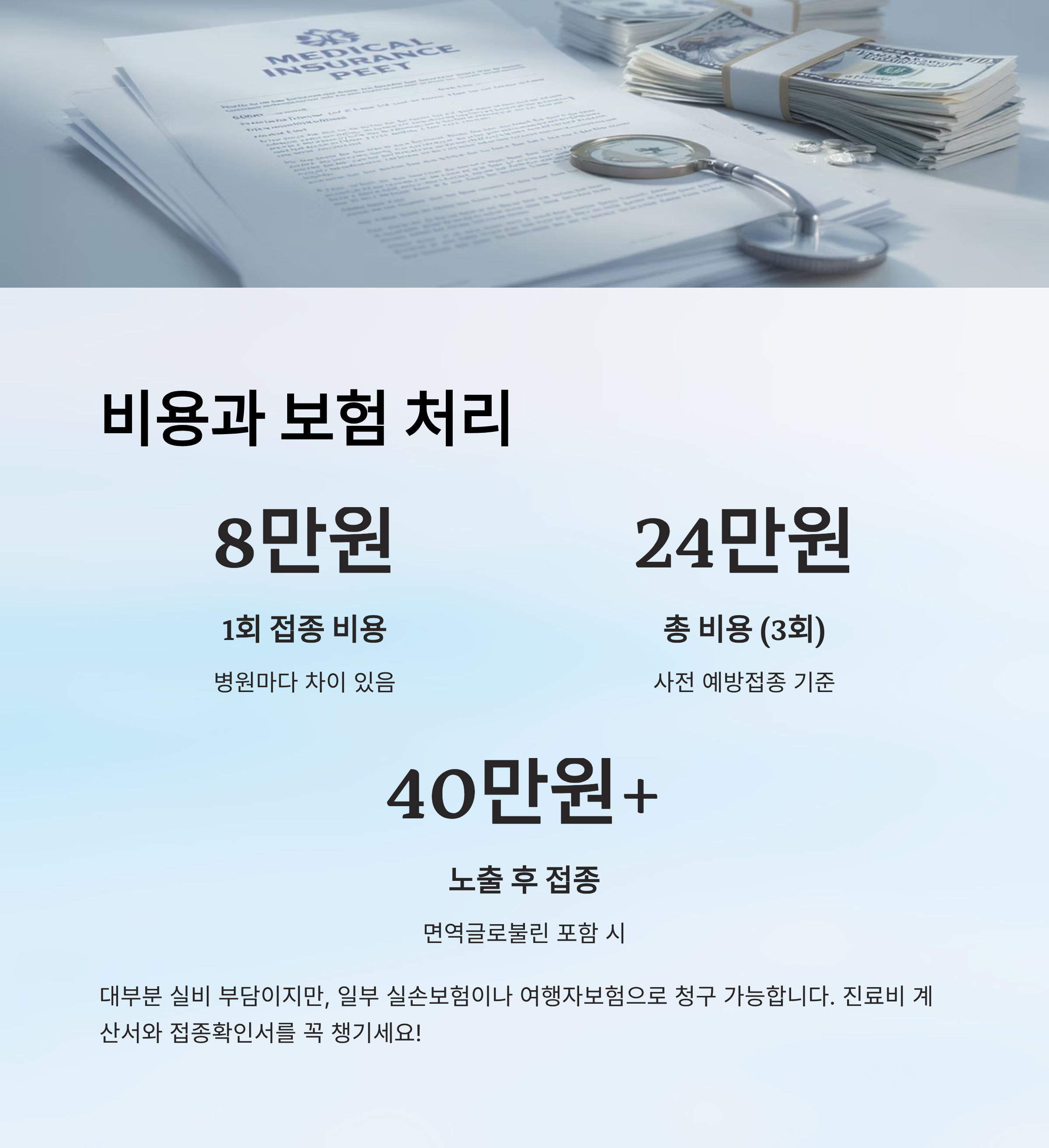 | 노출 후 접종 | 약 10만원 | 40만원 이상 | 중간~높음 |