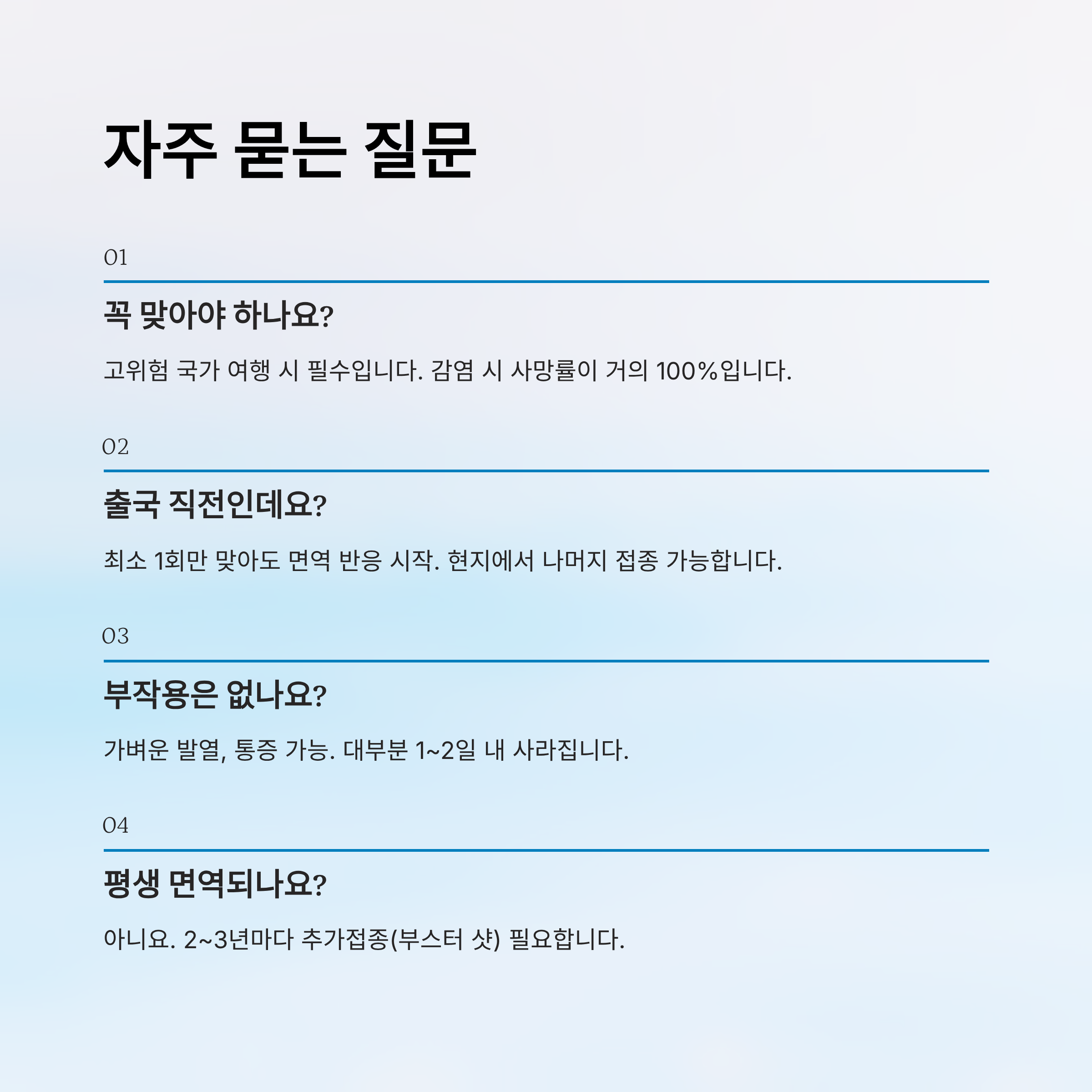 A1. 해외에서 동물과의 접촉 가능성이 높은 국가로 여행할 경우 예방접종은 생명을 지킬 수 있는 중요한 대비책이에요. 감염 시 사망률이 매우 높기 때문에 선택이 아닌 필수라고 생각하면 돼요.