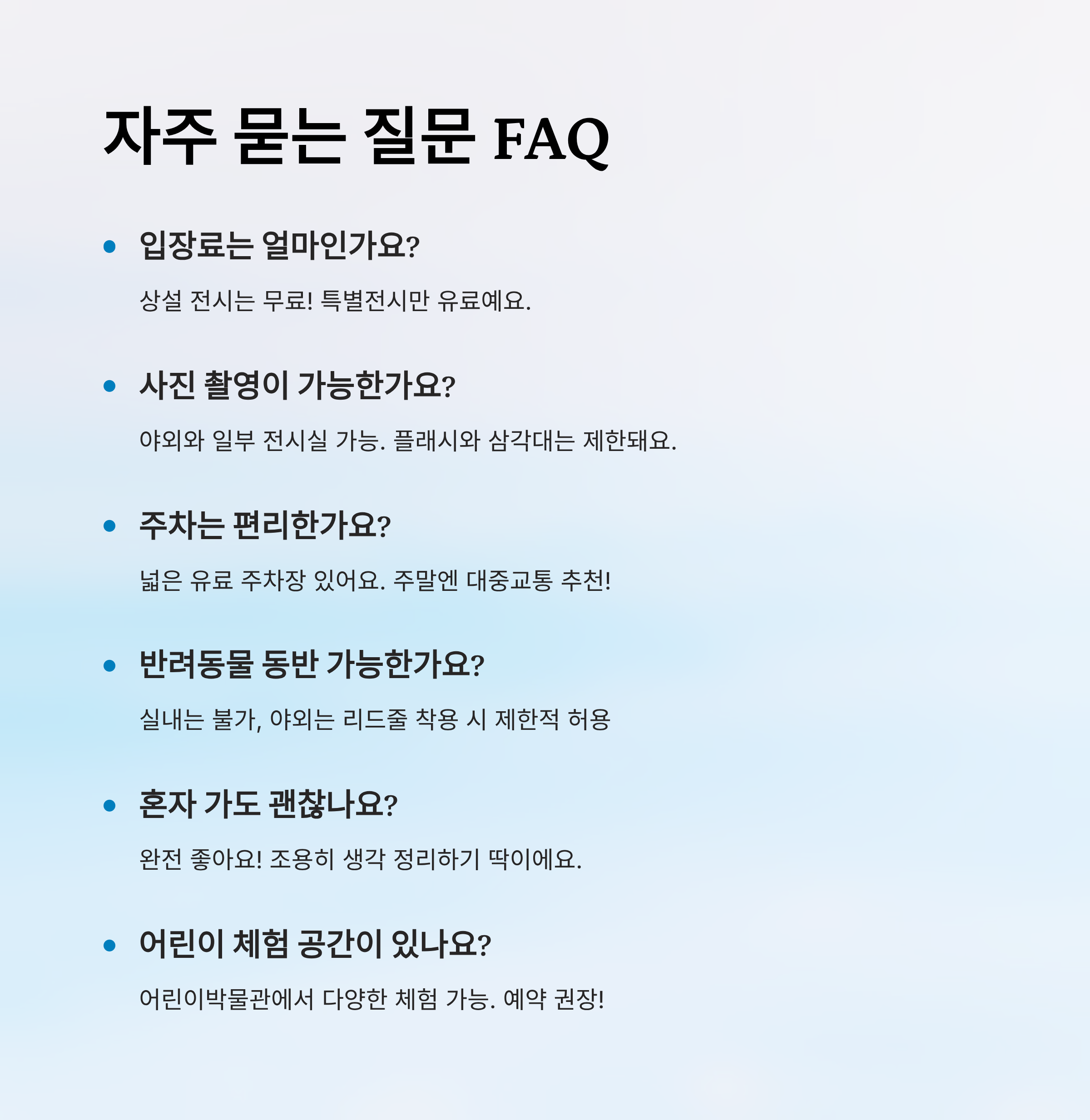 A1. 상설 전시는 무료이며, 특별전시는 유료예요. 특별전 가격은 전시마다 다르니 홈페이지 참고해 주세요.
