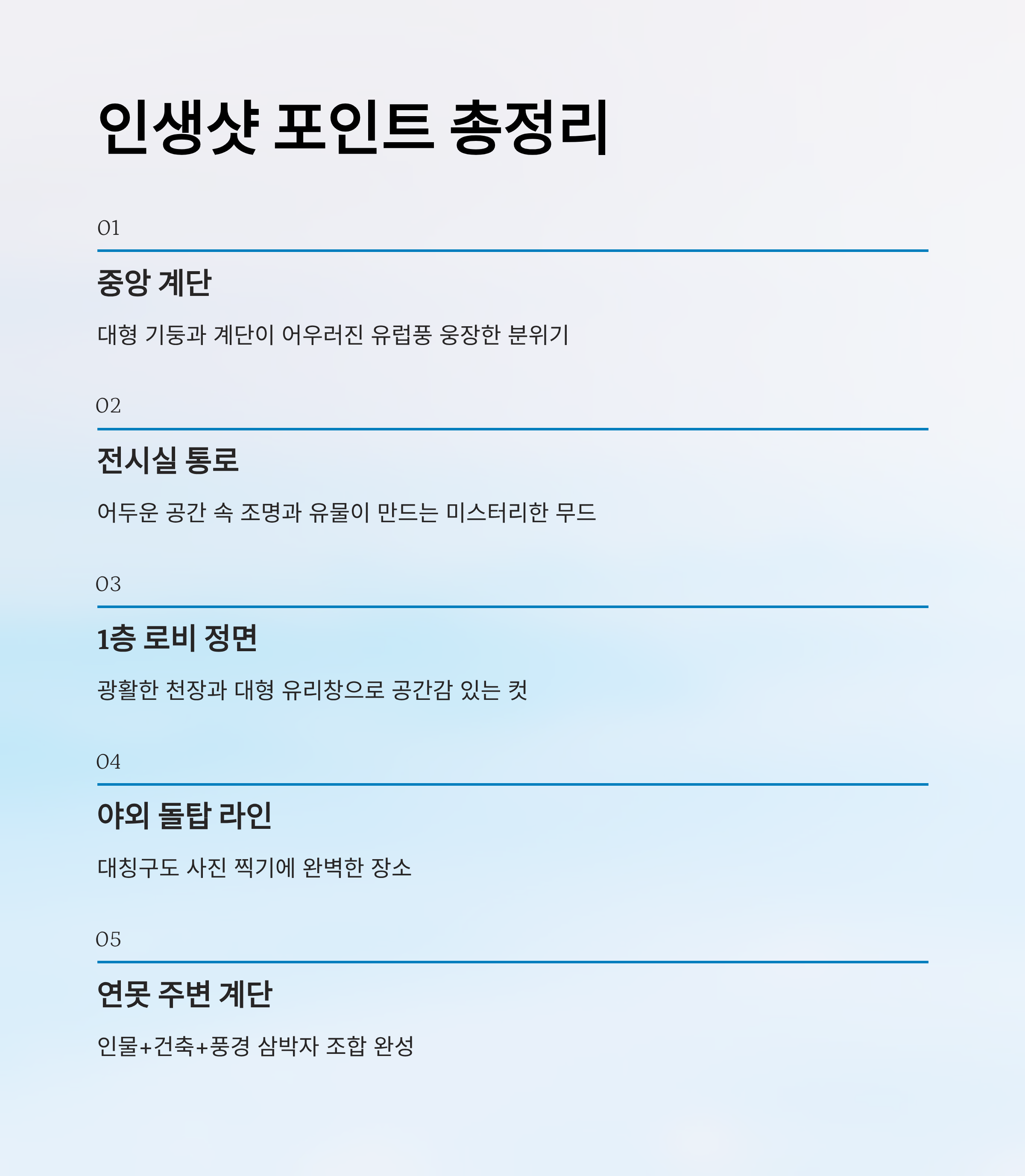 | 위치 | 분위기 | 주요 요소 | 사진 포인트 |