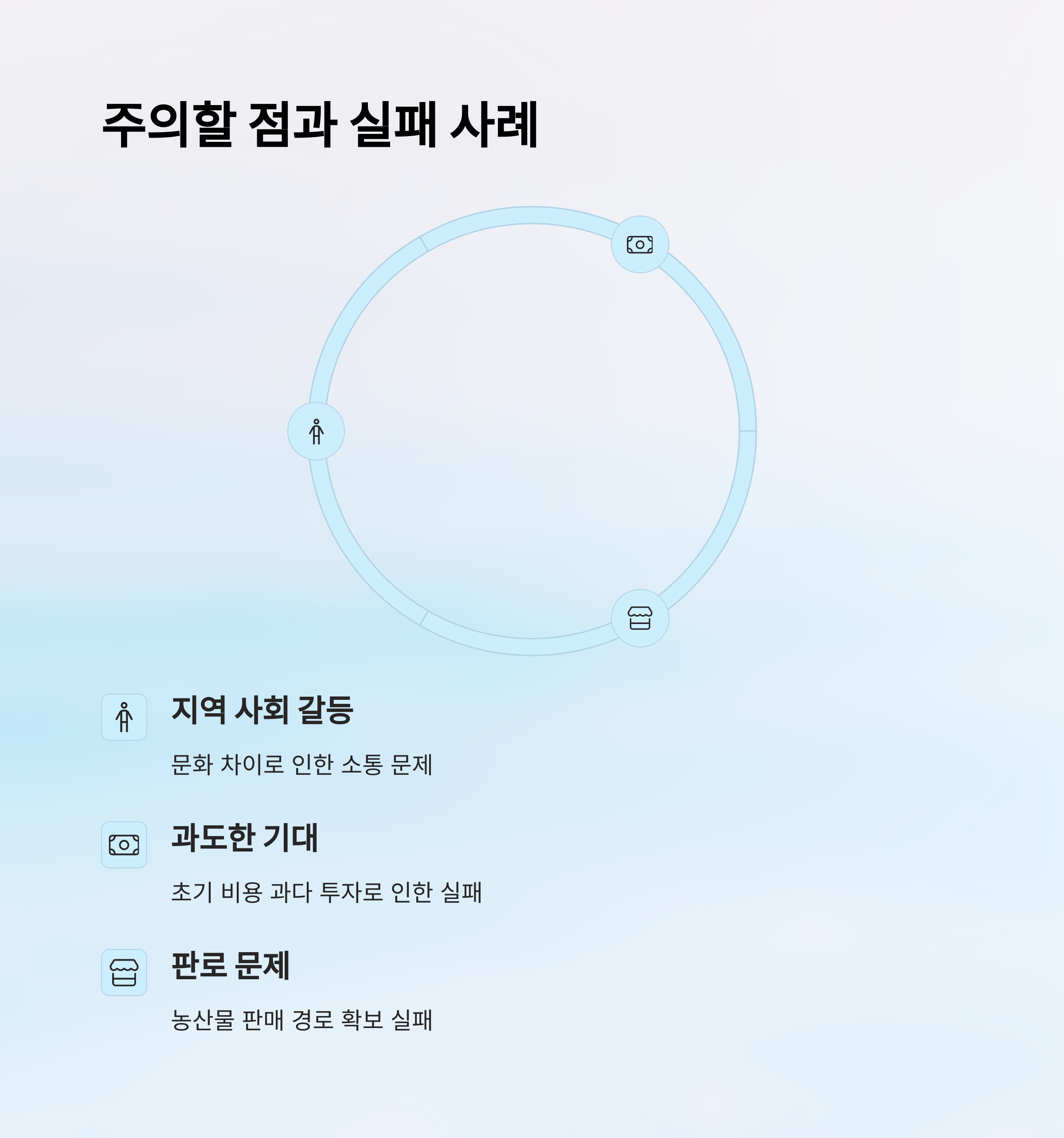 | 영농 준비 부족 | 작물 선택 실패, 판로 미확보 |