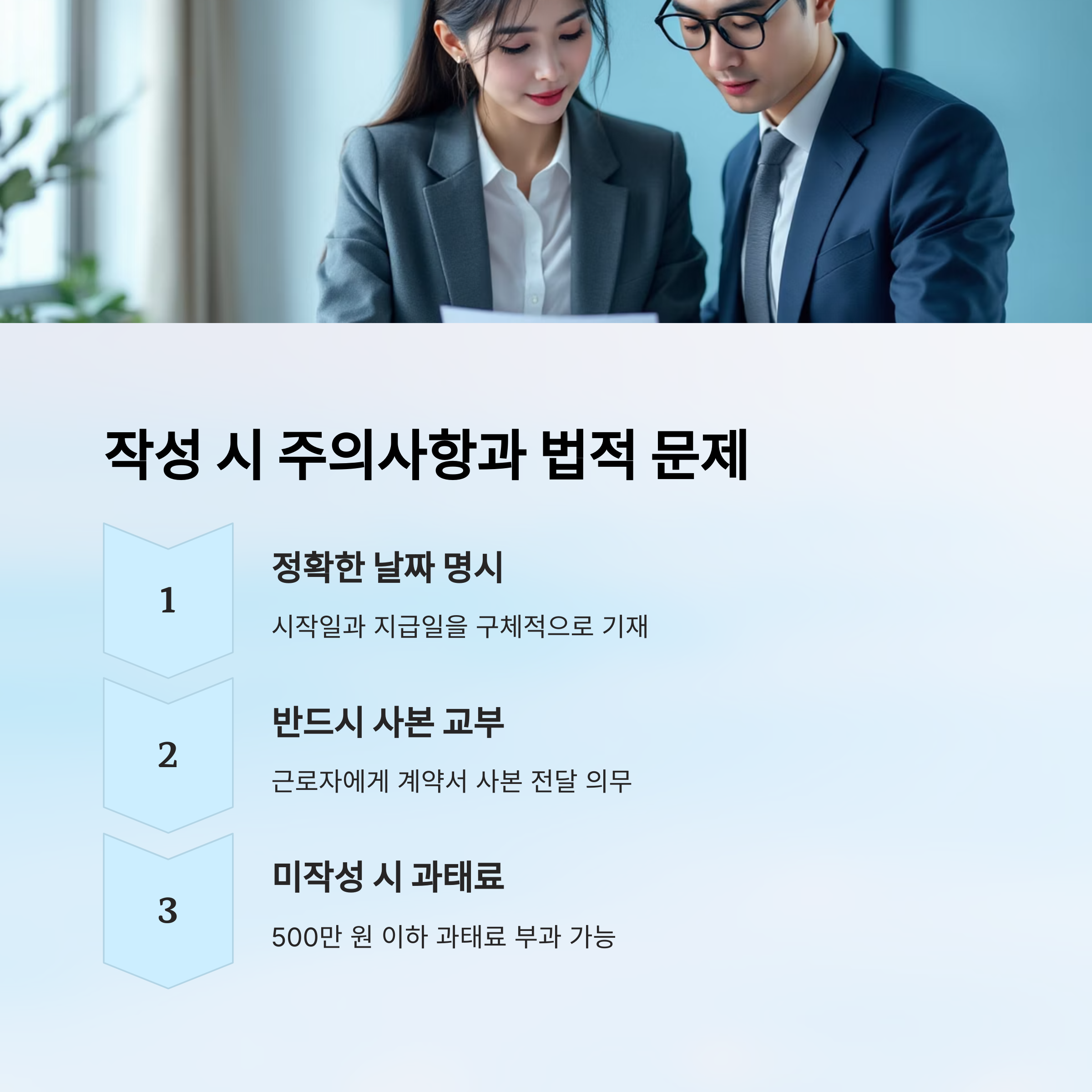 마지막으로 반드시 근로자에게 계약서 사본을 교부해야 해요. 이를 지키지 않으면 500만 원 이하의 과태료가 부과될 수 있어요. 작성과 교부는 동시에 진행하는 게 원칙이에요.
