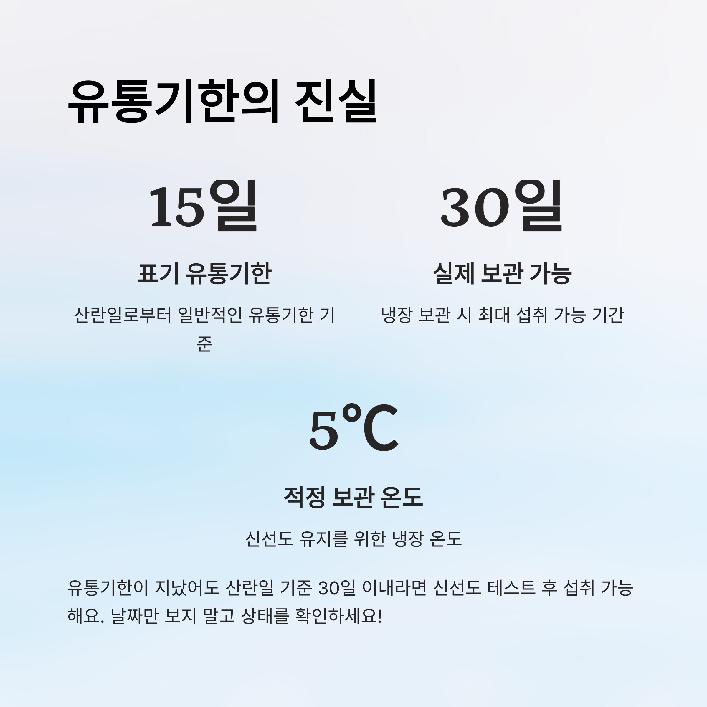 A3. 산란일 기준으로 30일 이내라면 신선도 테스트 후 섭취 가능해요. 유통기한은 참고용이에요.