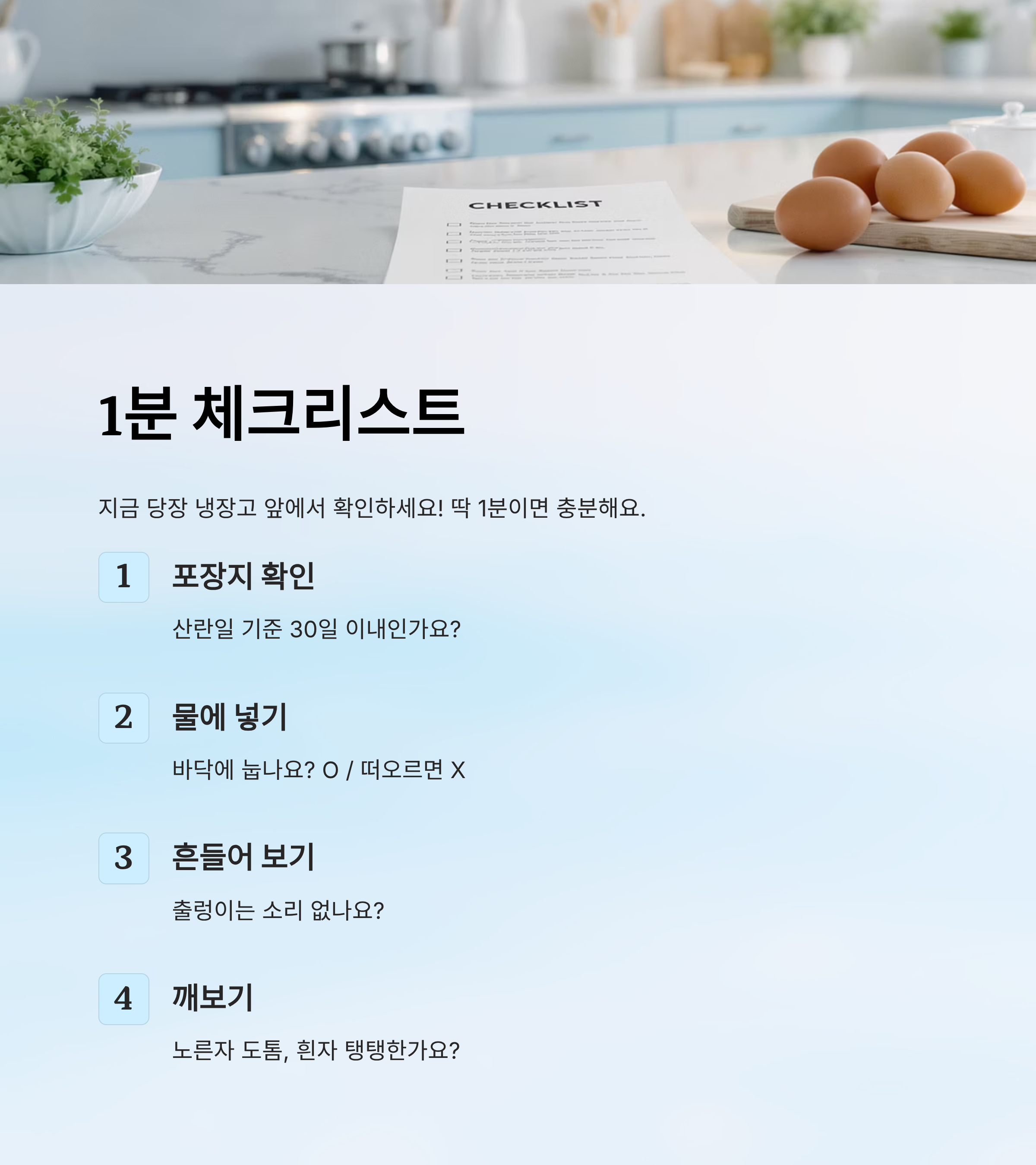 그러니 오늘부터는 유통기한이라는 숫자보다 ‘상태 확인’을 더 중요하게 보세요. 아래부터는 계란의 상태를 확인하는 다양한 방법을 체크리스트로 알려드릴게요. 🚀