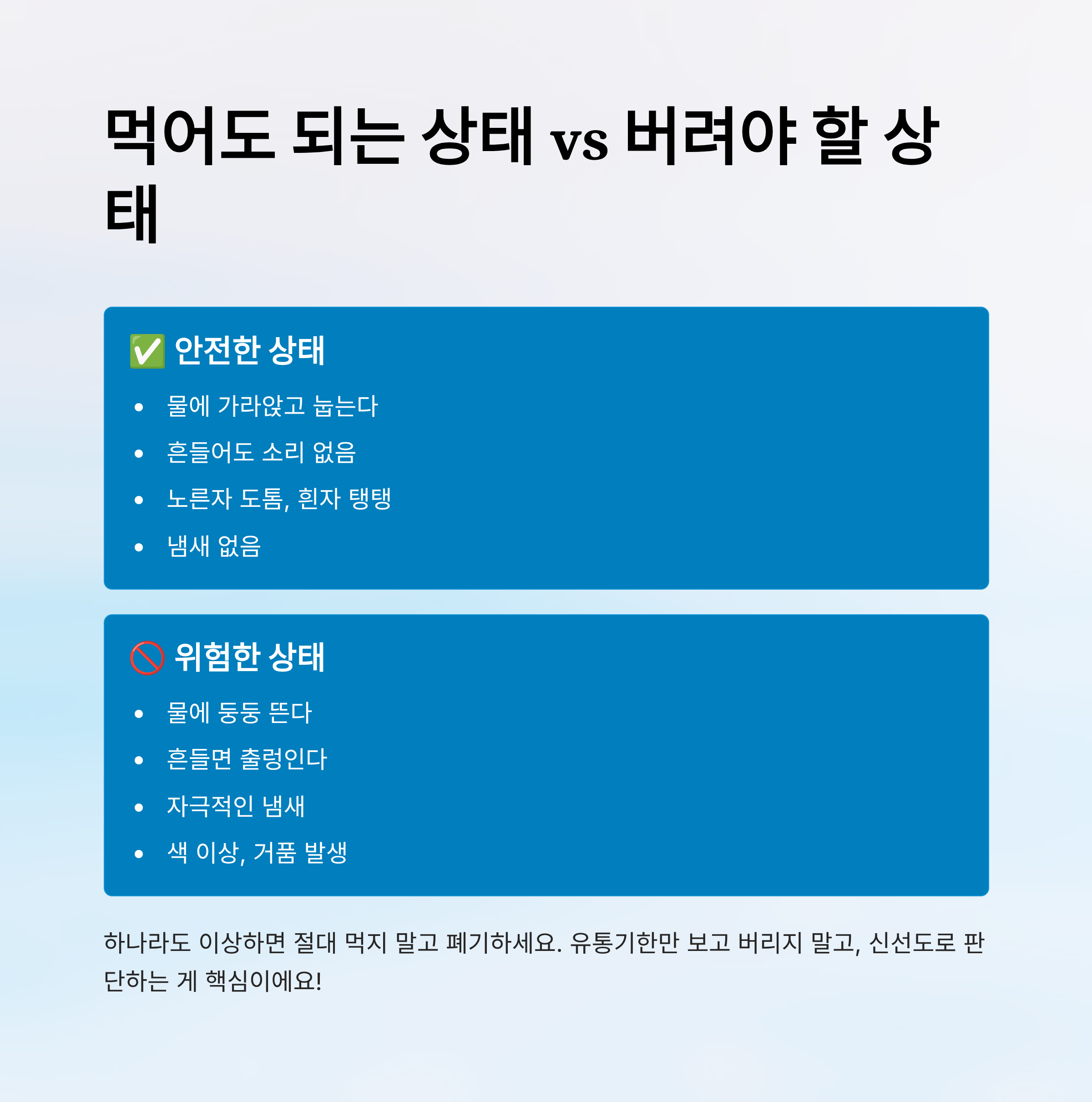 🚫 하나라도 이상하면 절대 먹지 말고 폐기하세요.