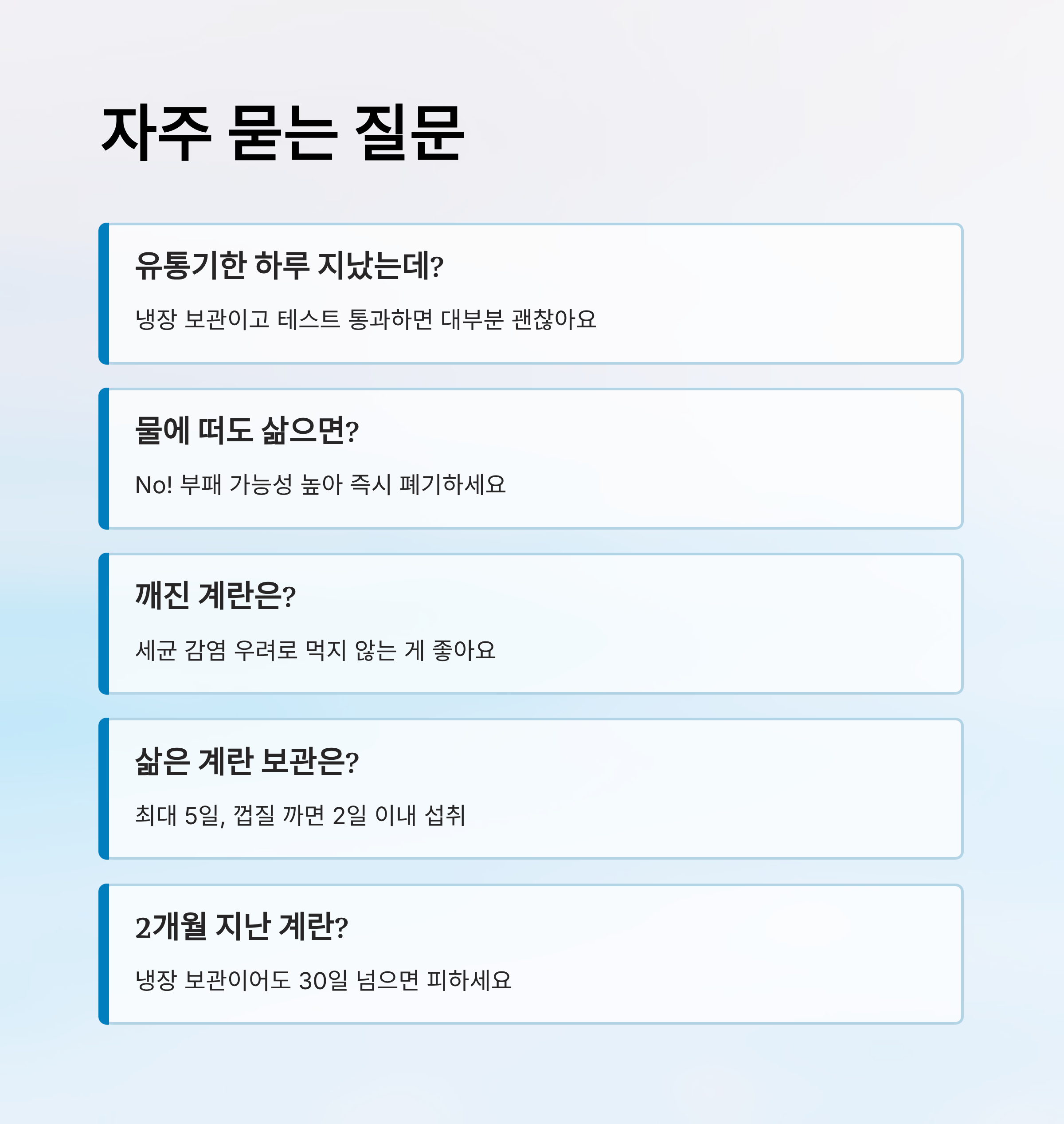 신선한 계란은 껍데기가 매끄럽고, 보관 온도 변화가 없었다면 유통기한 이후에도 먹을 수 있는 경우가 있어요. 반대로, 유통기한이 남았더라도 보관 상태가 불량하면 상할 수 있으니 '날짜만 보고 판단하지 않는 것'이 핵심이에요!