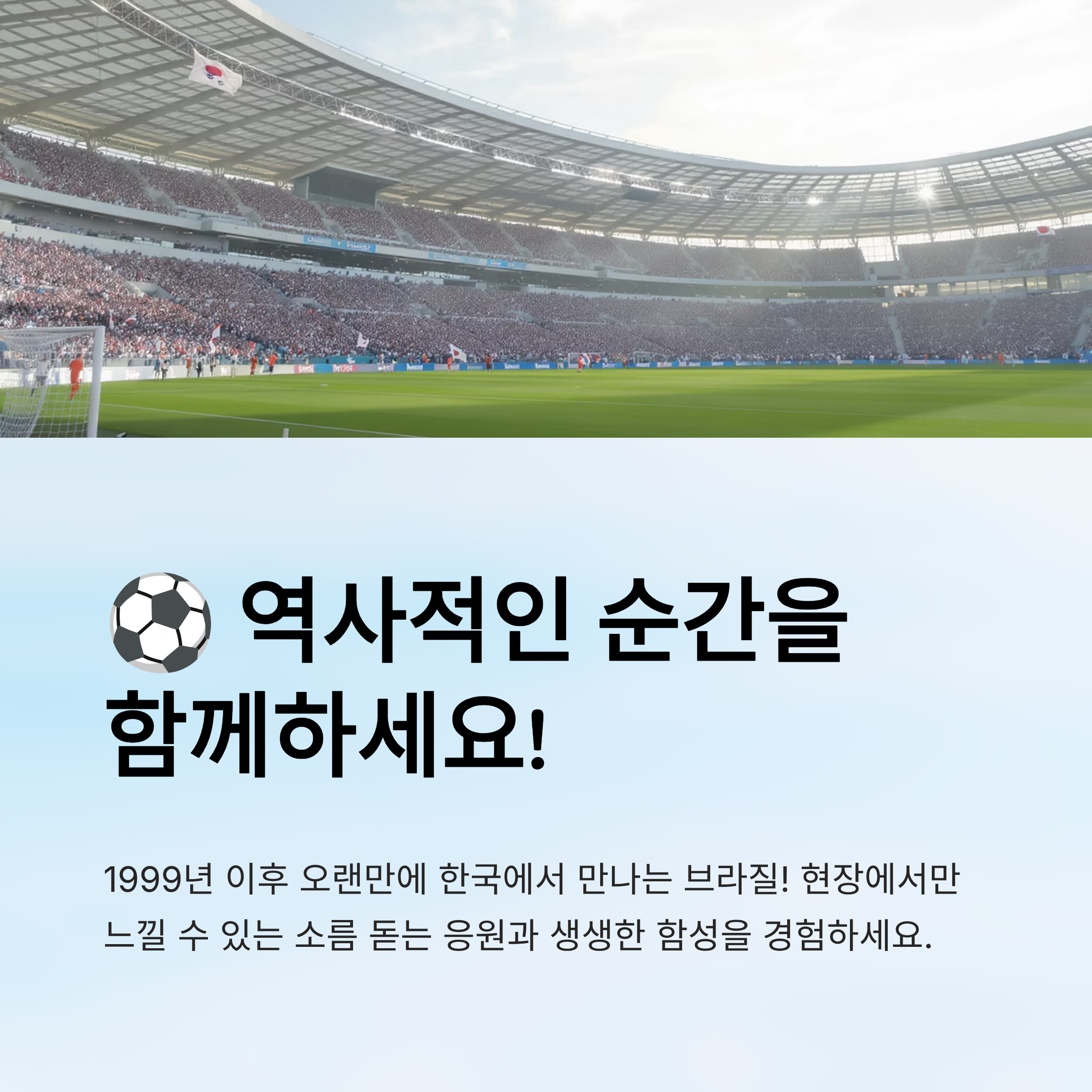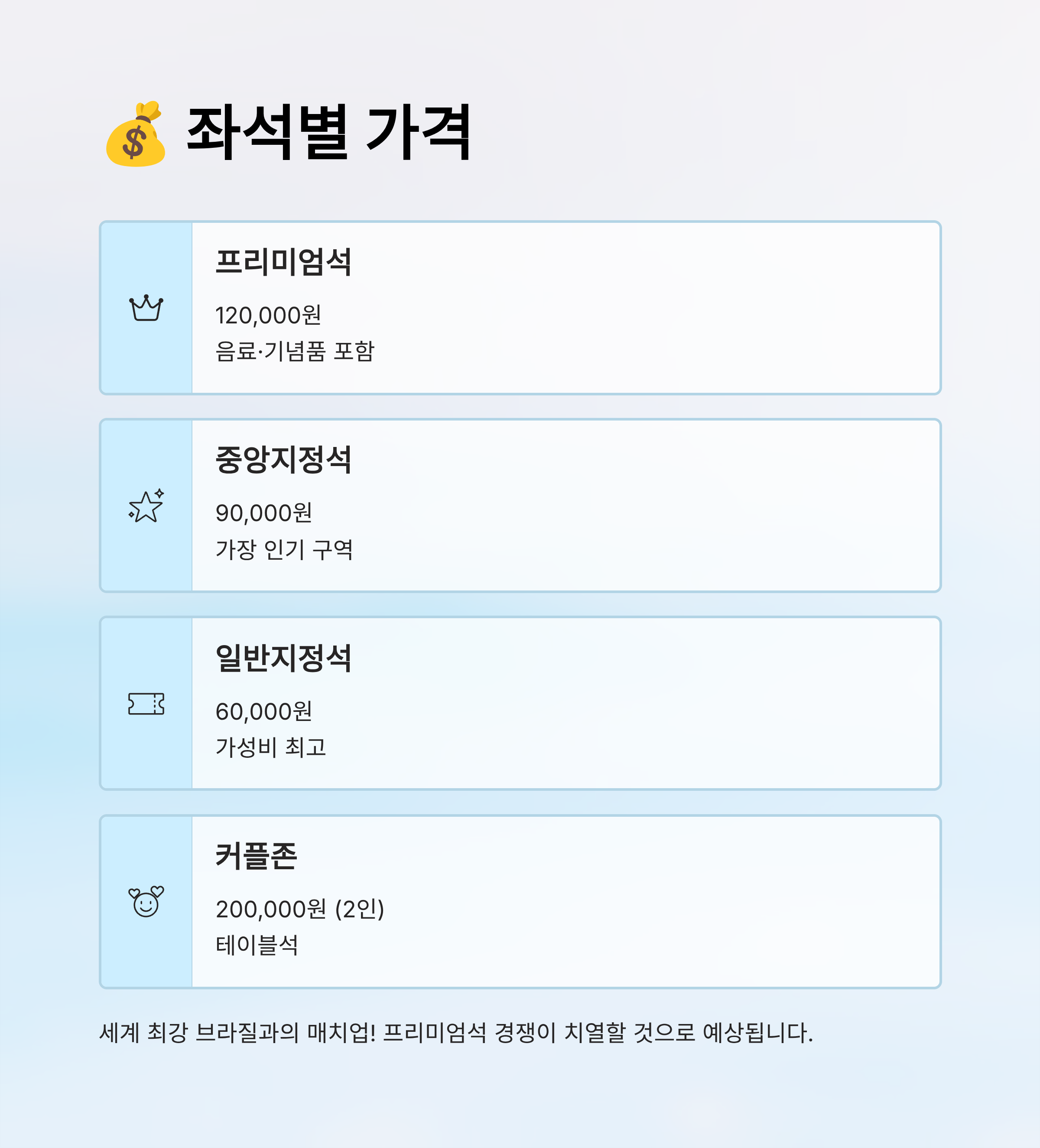 티켓 가격은 경기 등급, 상대 팀, 좌석 위치에 따라 변동이 있을 수 있어요. 이번 경기처럼 세계 최강 브라질과의 매치업이라면 프리미엄석 경쟁이 정말 치열할 거예요.