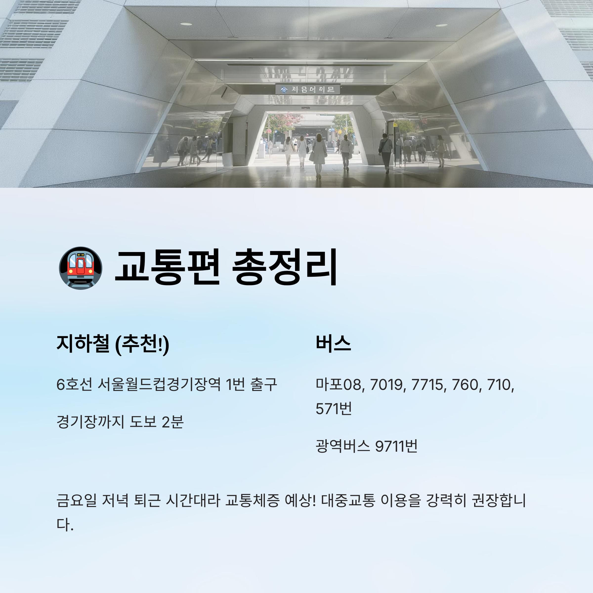 그래서 가장 추천되는 이동 방법은 대중교통이에요. 지하철 6호선 서울월드컵경기장역 1번 출구로 나가면 바로 경기장과 연결돼 있어요. 경기장 입구까지 2분이면 도착 가능해요! 👍