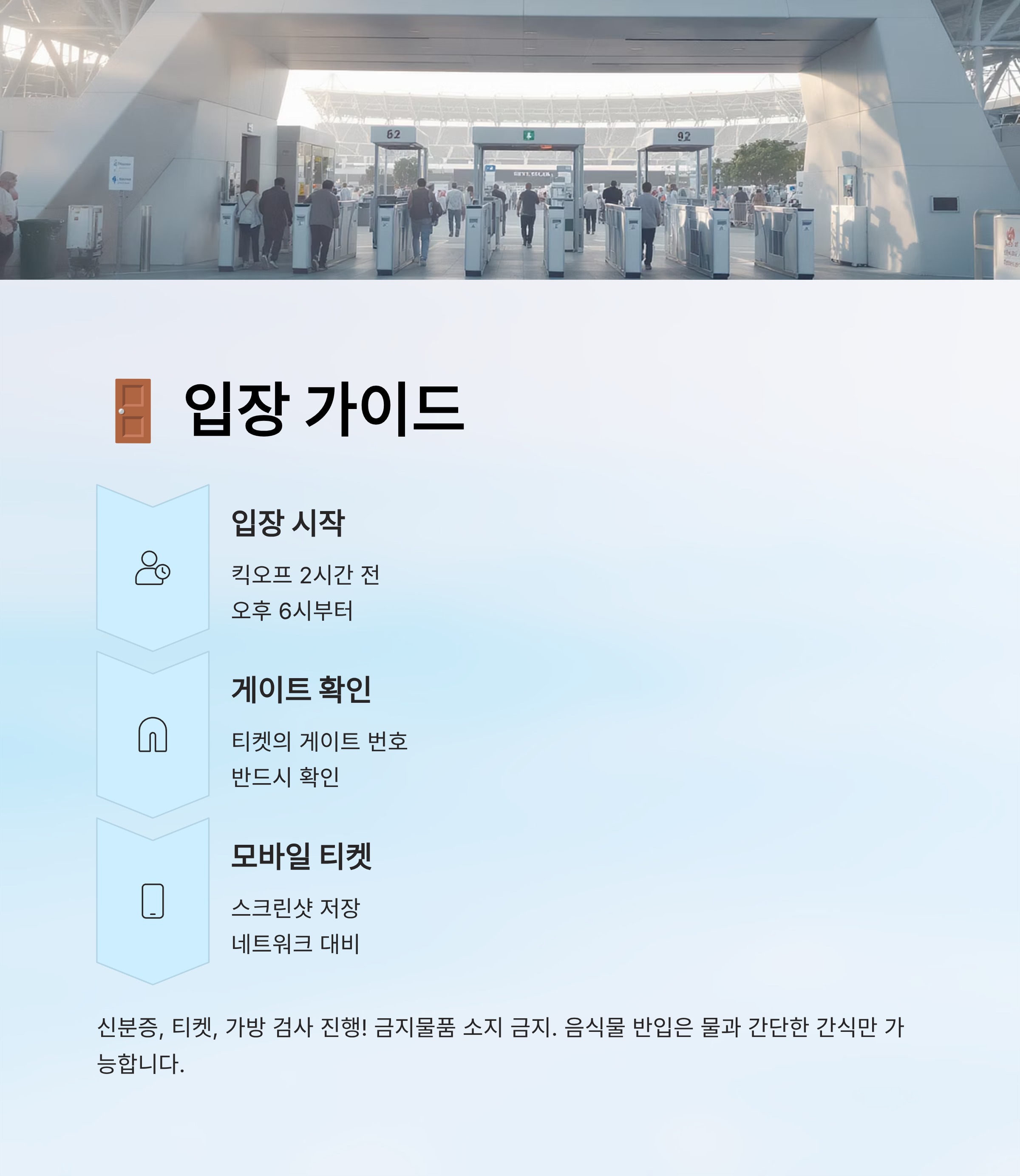 현장에서는 좌석 구역별 입장 게이트가 다르기 때문에, 반드시 티켓에 기재된 게이트 번호를 확인하고 그쪽으로 입장하셔야 해요. 잘못된 게이트로 가면 입장이 제한될 수 있어요.