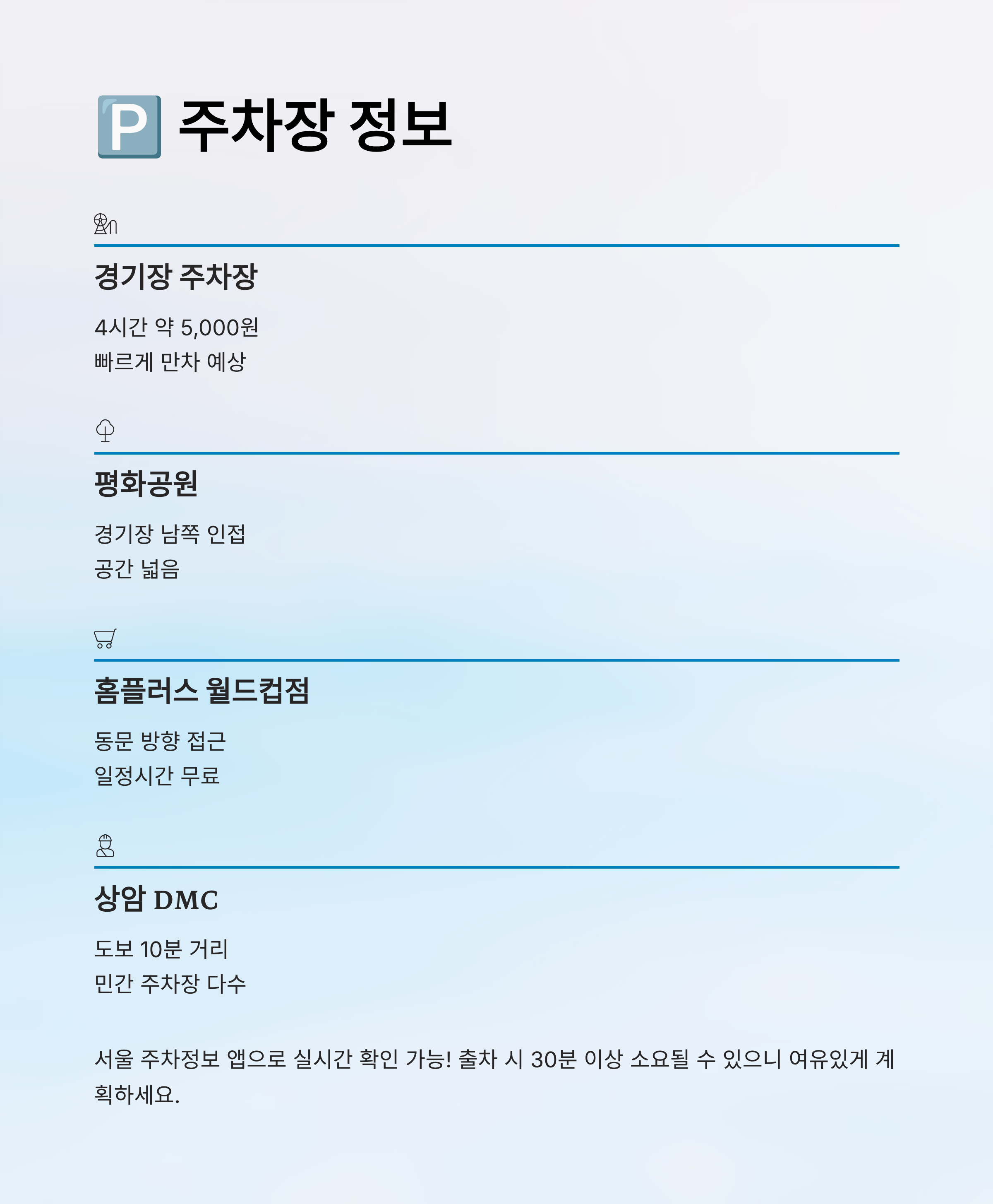 자동차를 이용하시는 분들은 경기장 내 서문 주차장, 동문 홈플러스 주차장, 그리고 평화공원 주차장을 고려하실 수 있어요. 하지만 대형 경기일 경우 빠르게 만차가 되기 때문에 일찍 도착하거나 대중교통이 훨씬 효율적이에요.