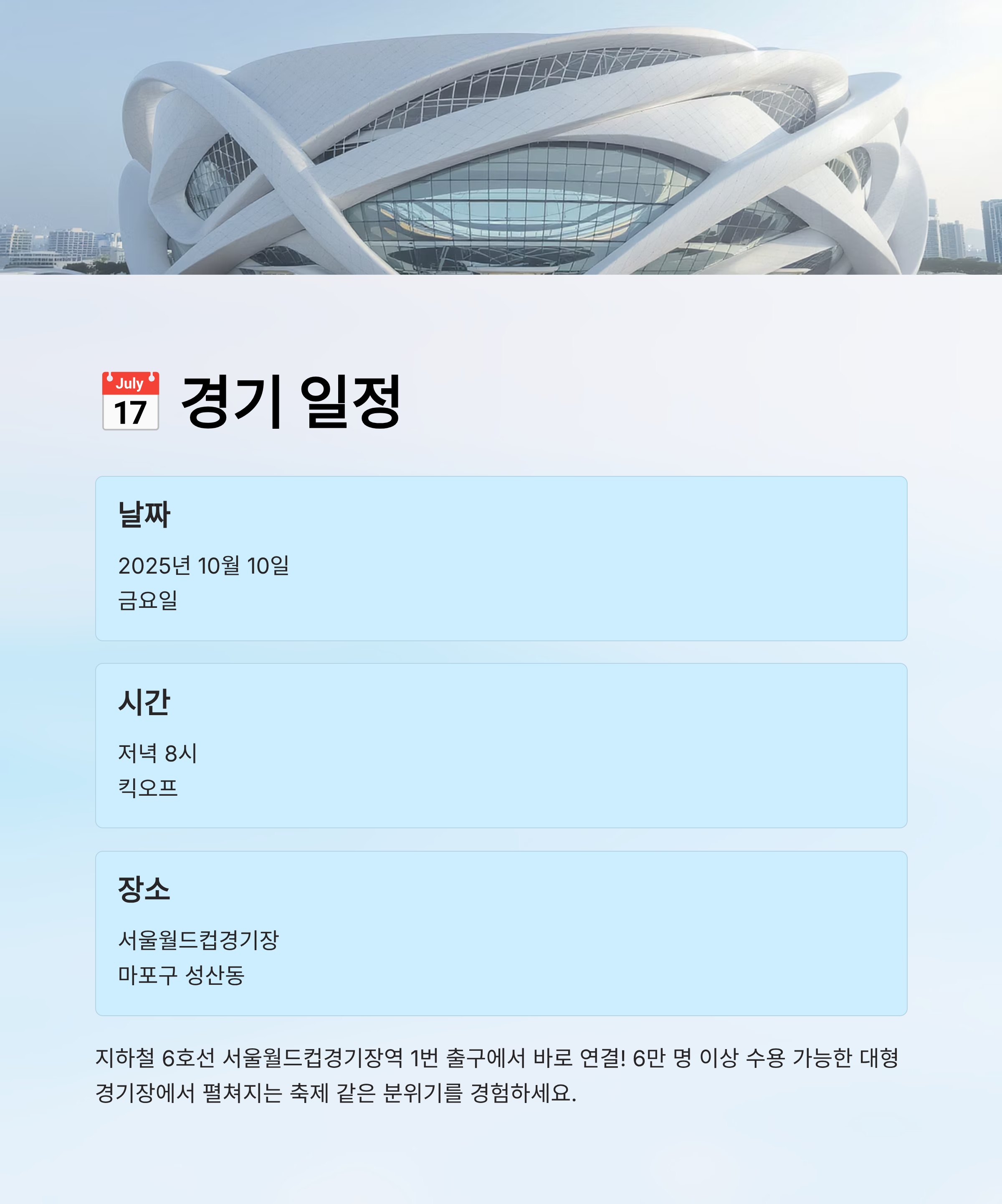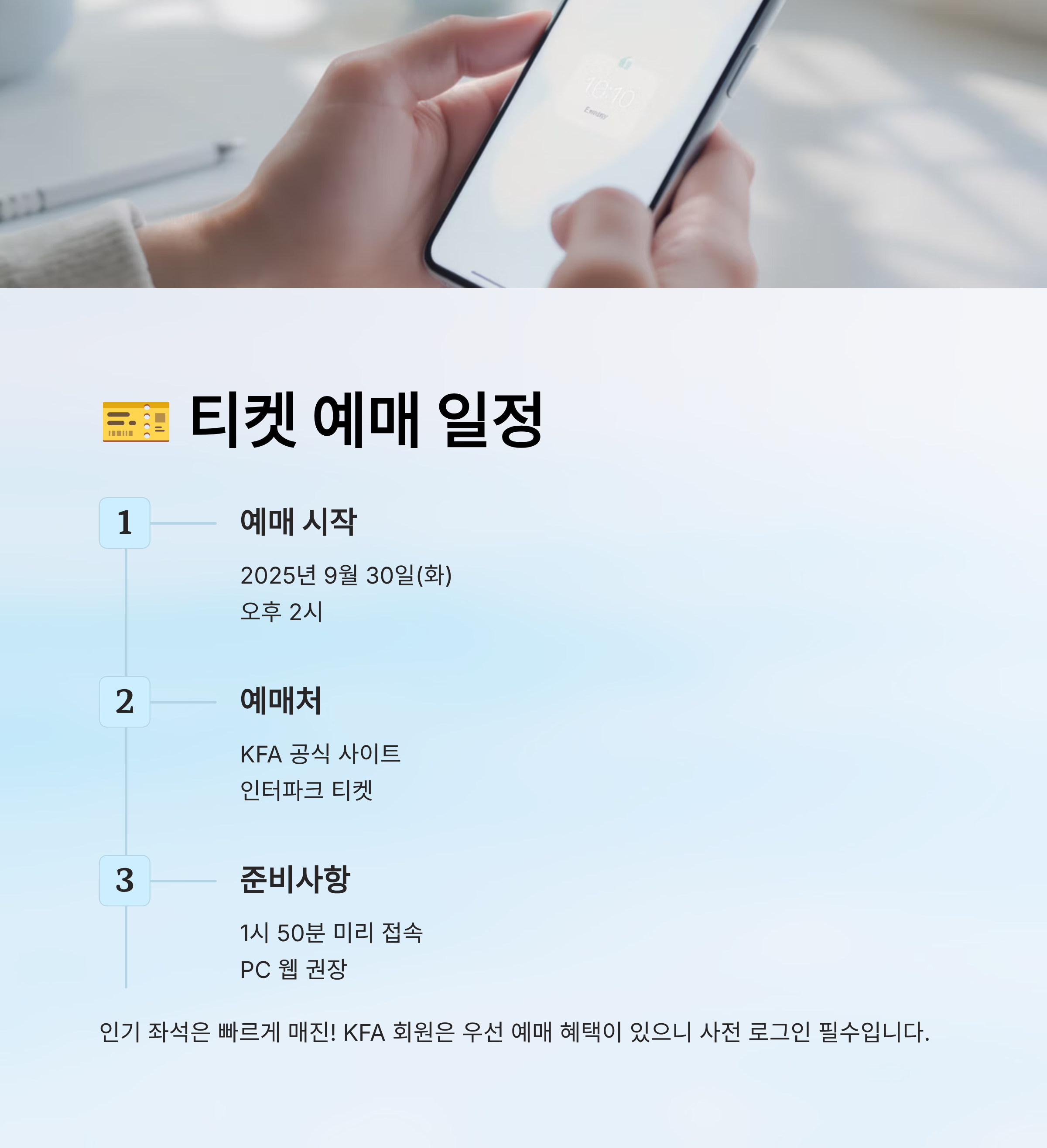 ※ 본 정보는 2025년 9월 기준으로 작성되었으며, 실제 예매 및 경기 운영 정보는 KFA 공식 발표를 기준으로 달라질 수 있어요. 모든 정보는 참고용으로 제공됩니다.