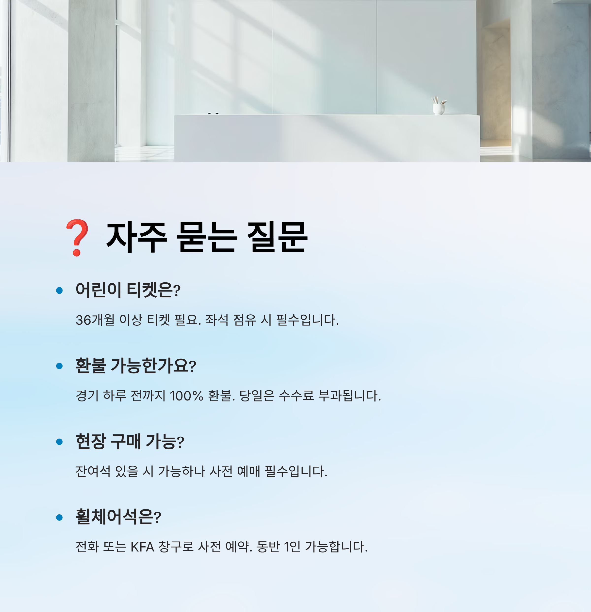 또한 KFA 회원이라면 등급에 따라 우선 예매 혜택도 제공되니, 사전에 회원가입 및 로그인 상태를 꼭 확인하세요. 티켓팅이 전쟁 같은 날이 될 수 있으니까요! 🔥