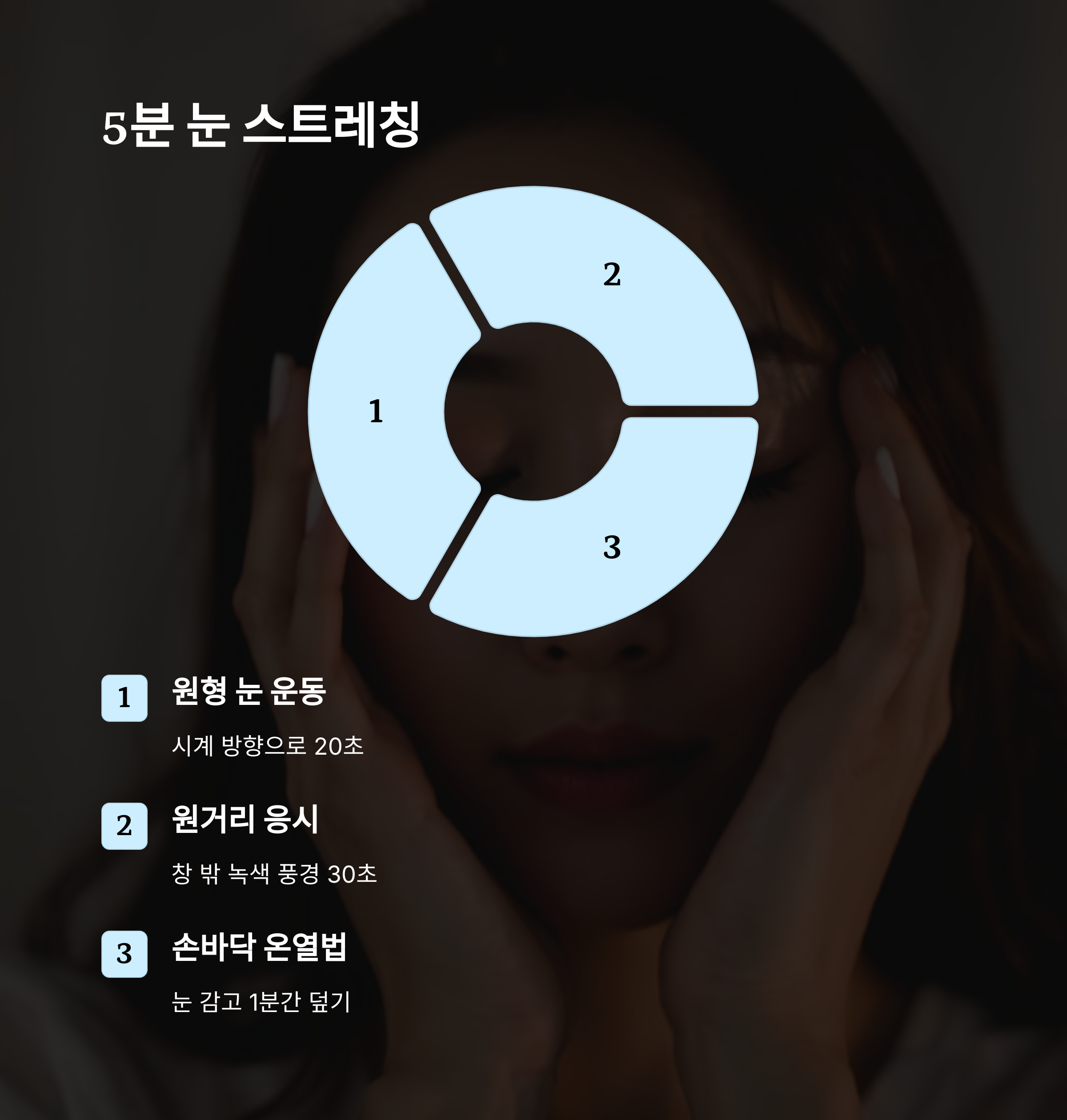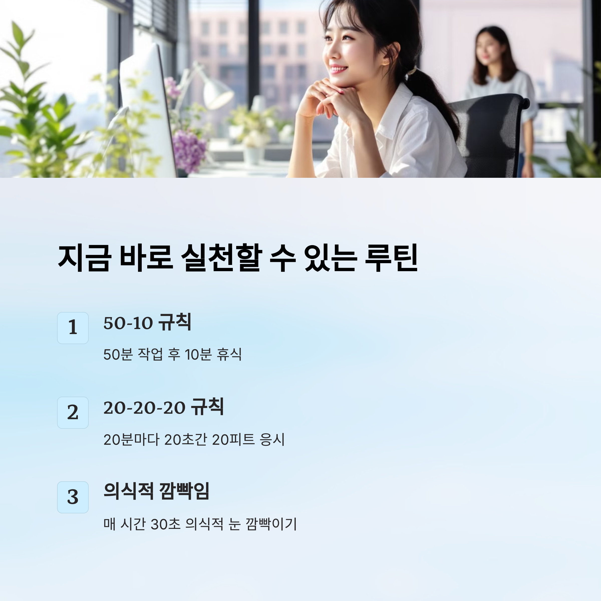 그래서 바로 다음에서 소개할 데일리 루틴으로 눈 피로를 날려보는 거예요! 🔄