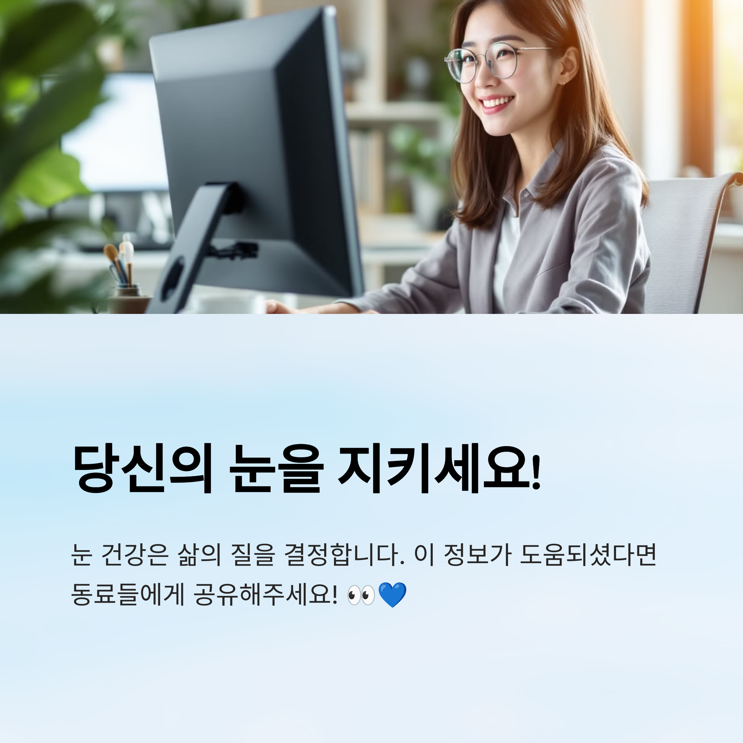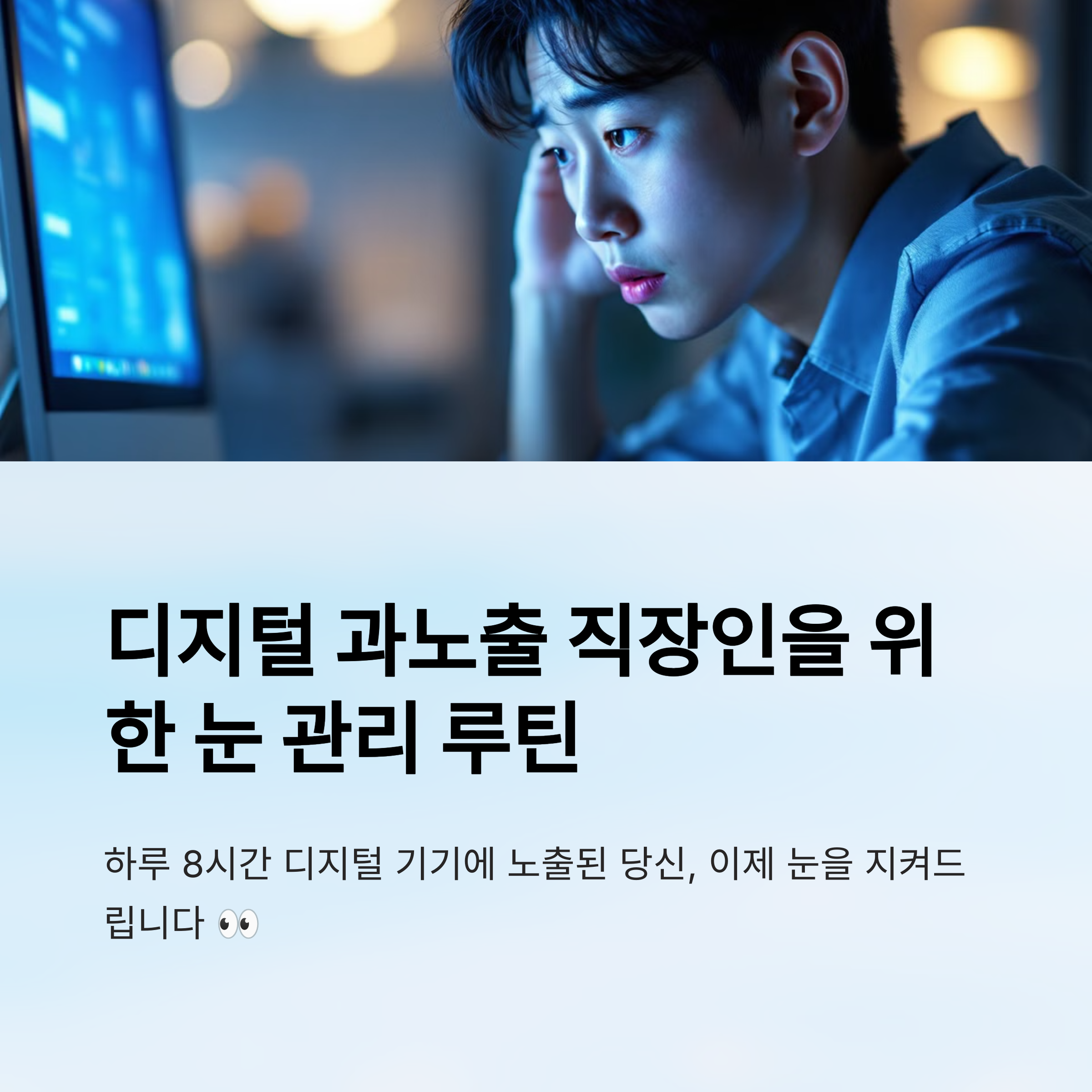 눈이 보내는 피로 신호를 알아차리고, 그에 맞는 루틴을 실천하는 것이 디지털 시대 직장인의 필수 건강 관리예요!