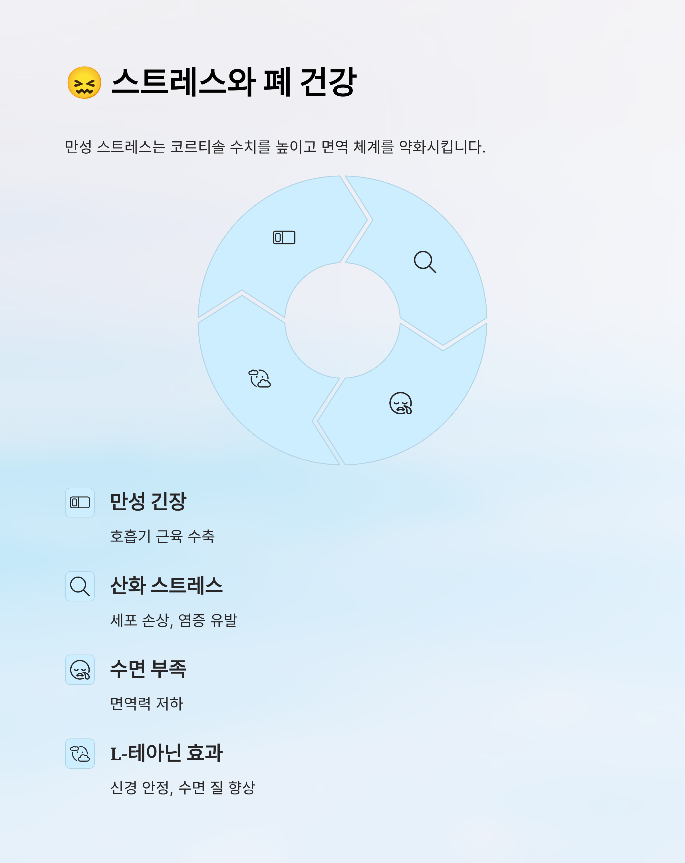 | 만성 긴장, 불안 | 호흡기 근육 수축, 산소 부족 | L-테아닌으로 신경 안정 |