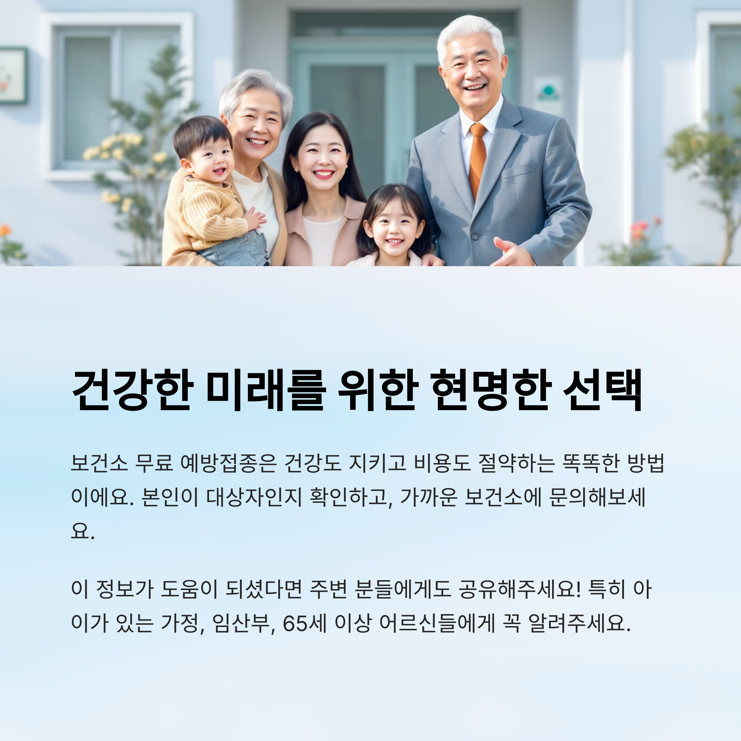 백신 접종을 받는 가장 큰 이유는 당연히 질병을 예방하기 위해서예요. 그런데 무료로 접종할 수 있다면? 그야말로 건강도 지키고, 지갑도 지키는 일석이조의 효과가 있는 셈이죠!
