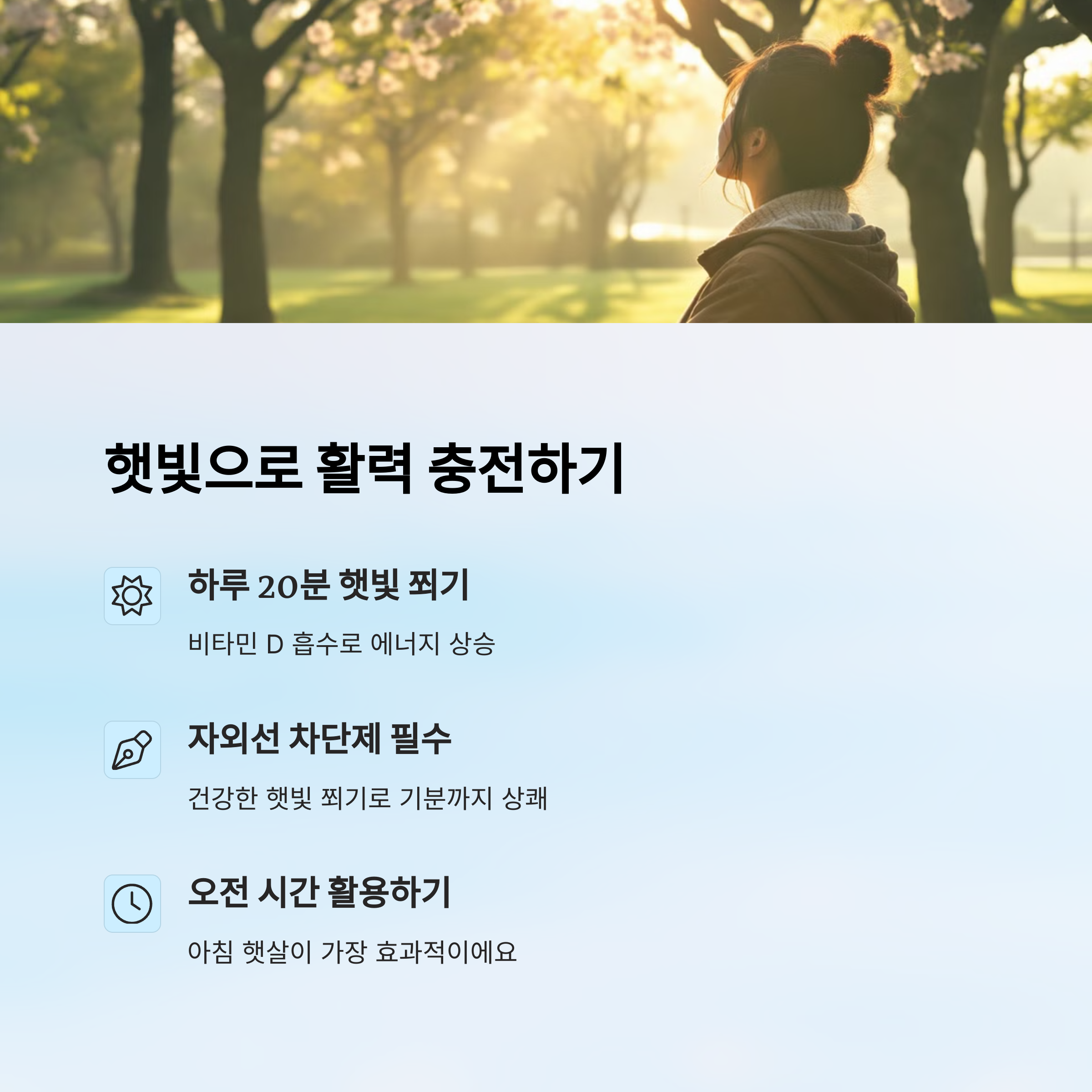 봄 햇살은 단순히 따뜻한 걸 넘어서, 피로를 없애주는 최고의 자연 치료제예요. 특히 비타민 D 합성을 돕고 기분을 개선시켜줘요. 🌤