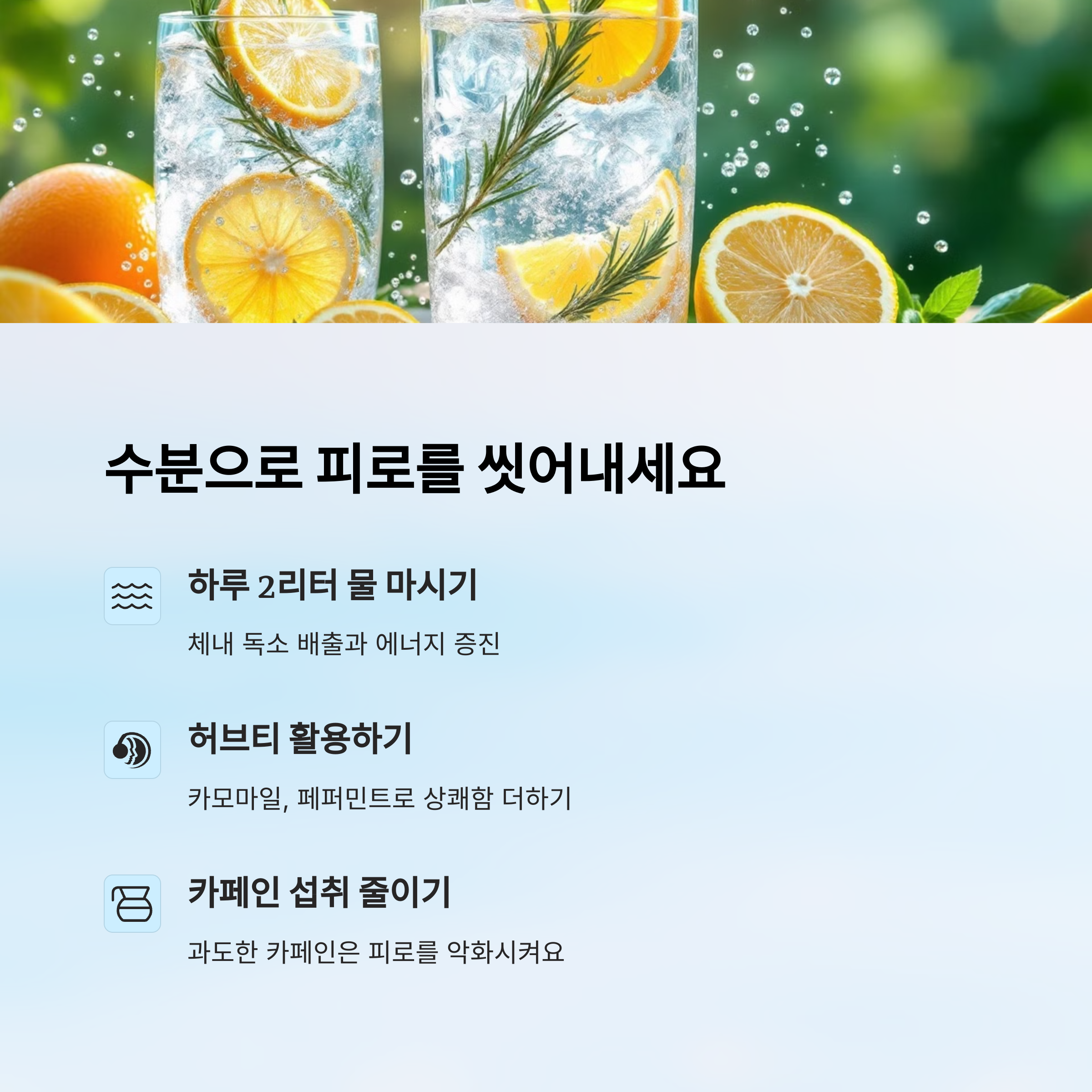 피로할수록 물을 더 많이 마셔야 한다는 사실, 알고 계셨나요? 수분 부족은 몸을 무겁게 만들고 두통까지 유발할 수 있어요. 💧