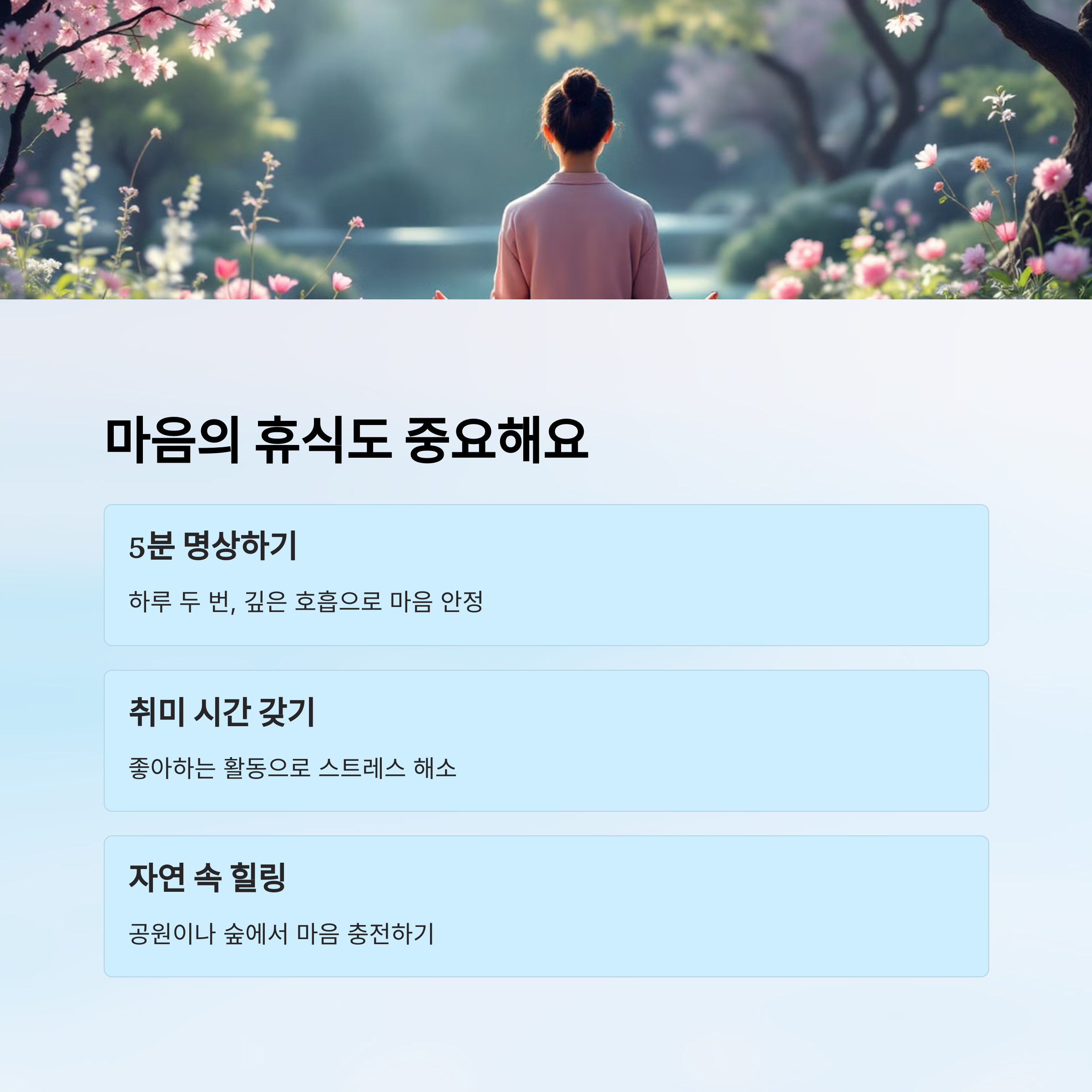 따라서 몸뿐만 아니라 ‘마음’도 함께 관리해주는 게 진짜 회복의 비결이에요. 아침에 간단한 감사 일기 쓰기, 좋아하는 음악 듣기부터 시작해보세요.