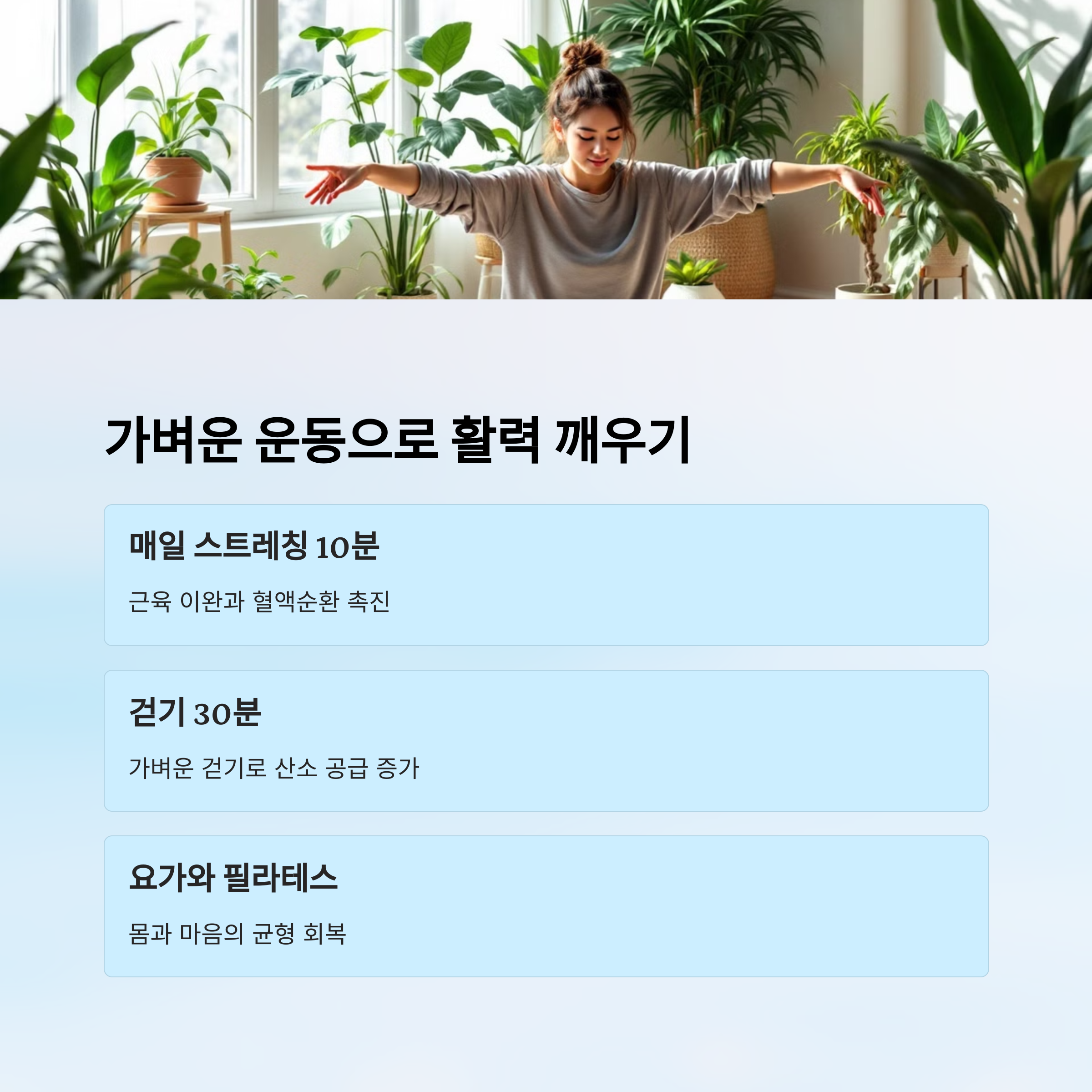 격한 운동보다는 요가, 필라테스, 계단 오르기처럼 무리가 덜한 운동이 좋아요. 꾸준히만 해도 피로감이 줄어드는 걸 느낄 수 있어요.