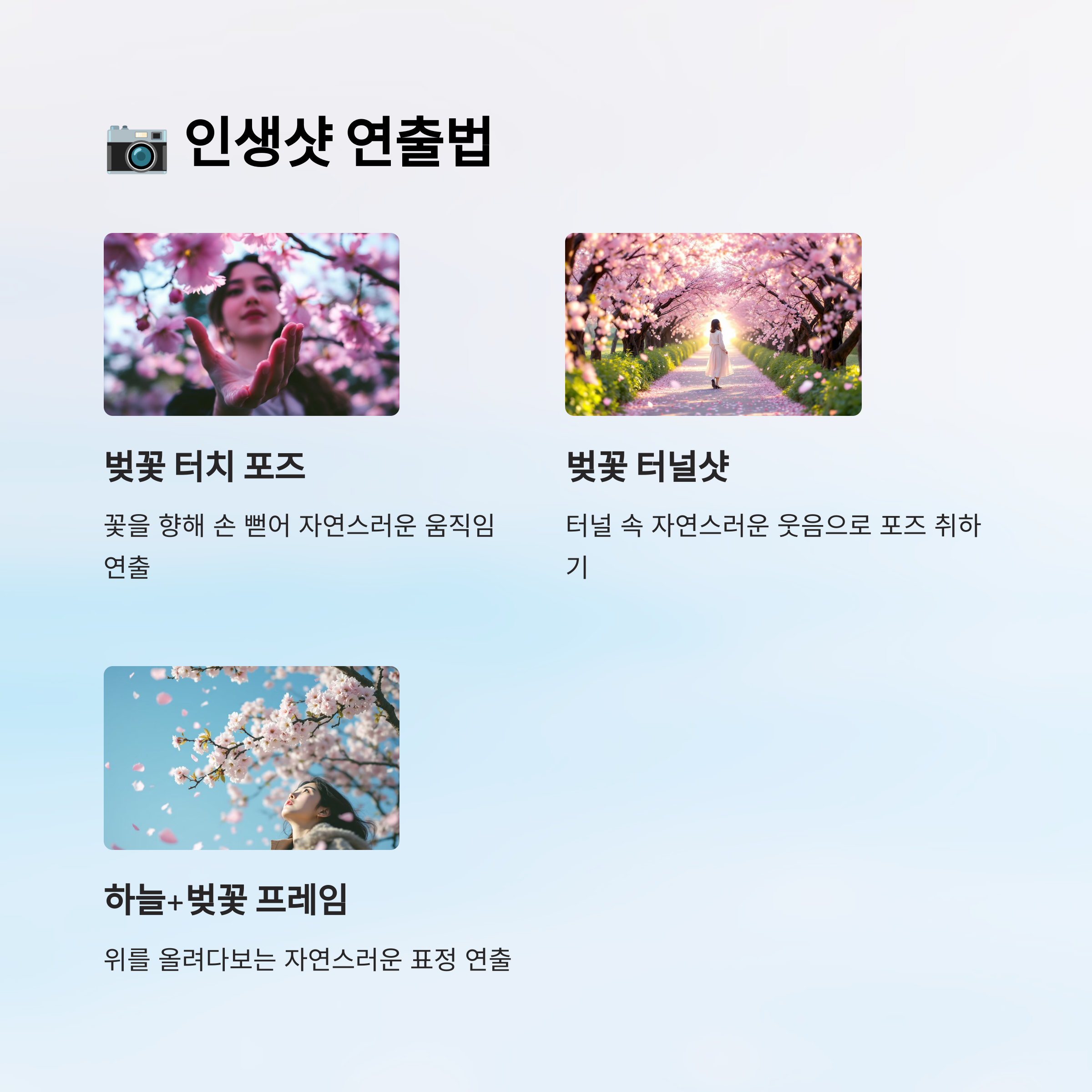 벚꽃 아래에서는 정면보다는 살짝 측면에서 찍거나, 머리카락을 정리하는 듯한 자연스러운 손짓이 들어간 포즈가 좋아요. 배경이 흐릿하게 나오는 아웃포커싱 효과를 활용하면 분위기 있는 사진을 쉽게 찍을 수 있어요.