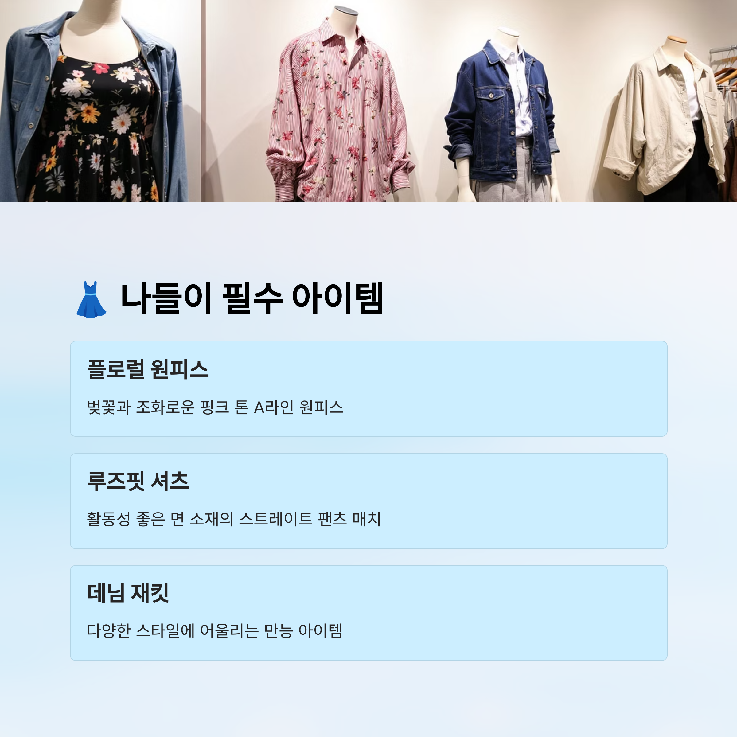 벚꽃 나들이에는 봄 특유의 가볍고 산뜻한 느낌이 담긴 아이템이 제격이에요. 여성분들은 셔츠 원피스, 플로럴 원피스, 레이스 디테일의 블라우스가 단연 인기예요. 걸을 때 살랑이는 실루엣이 정말 봄에 어울려요.