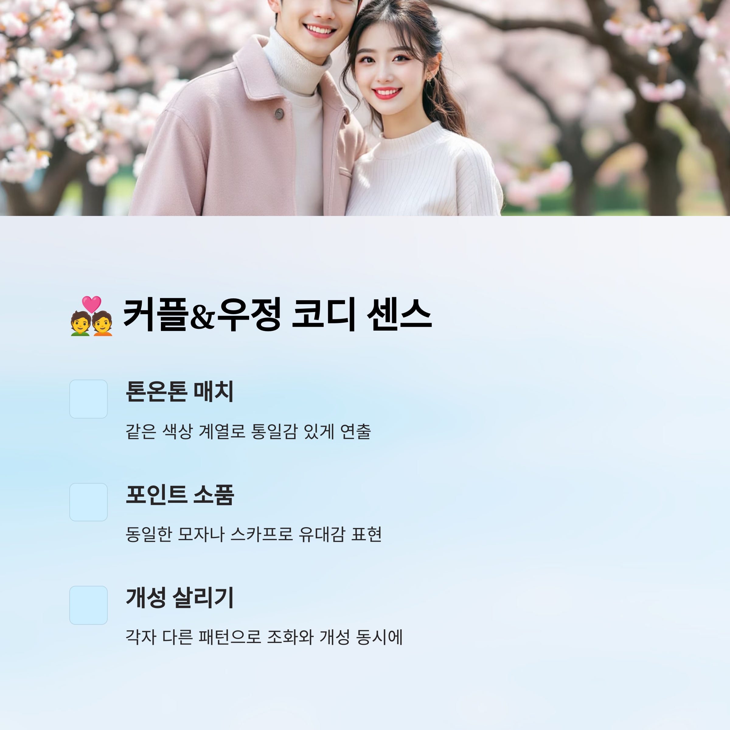 봄에는 커플이나 친구들끼리 맞춰 입는 우정룩이 더 눈에 띄어요. 벚꽃 배경 아래 비슷한 스타일의 옷을 입고 있으면 사진도 더 예쁘게 나오고, 보는 사람들도 흐뭇한 미소를 지을 만큼 사랑스러운 분위기를 자아내죠.