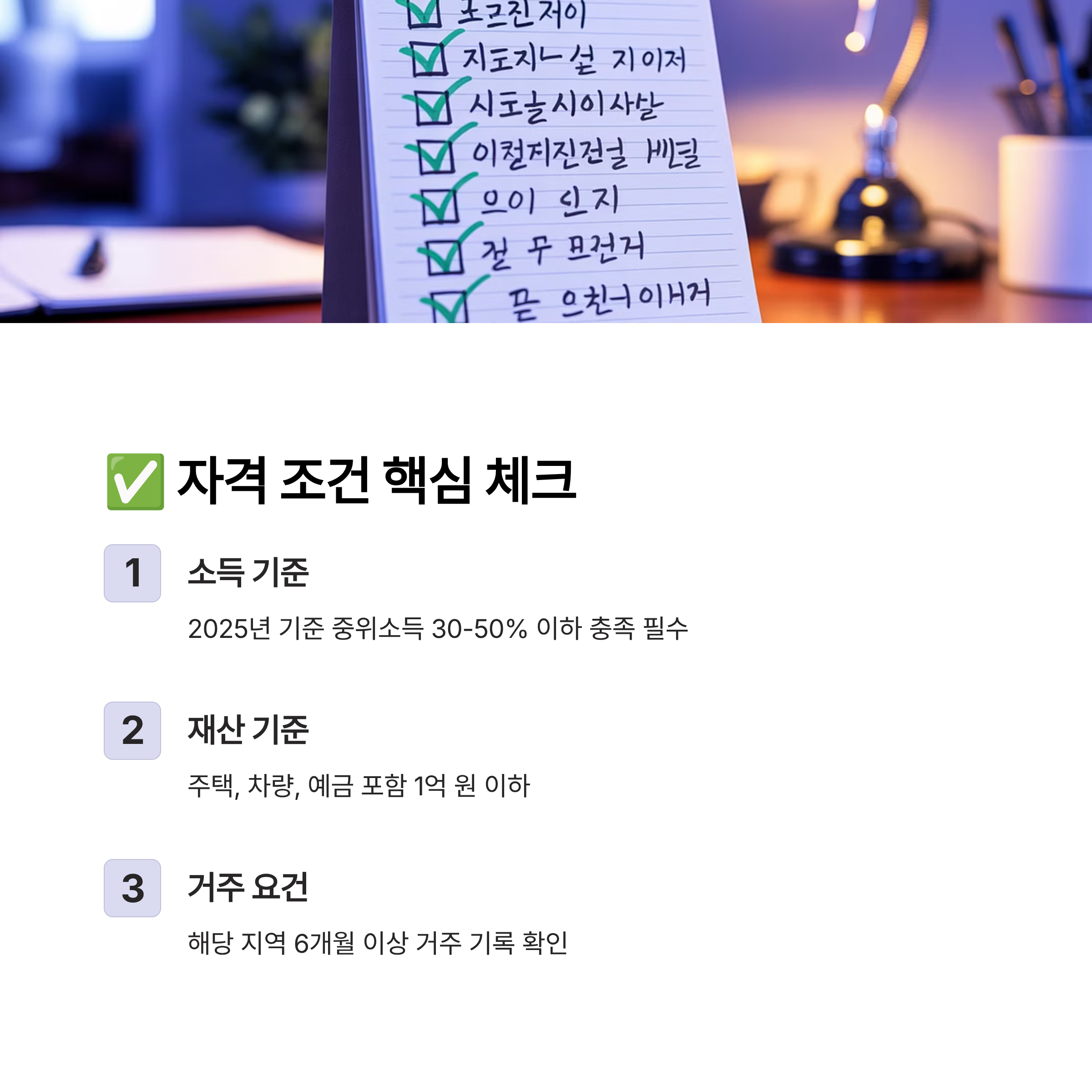 1️⃣ 소득 기준 충족: 대부분의 지원 제도는 '기준 중위소득'을 기준으로 자격을 나눠요. 예를 들어 기초생활수급자의 경우는 2025년 기준 중위소득의 약 30% 이하, 차상위 계층은 50% 이하를 충족해야 해요. 건강보험료 납입액으로 소득을 판단하는 경우도 많으니 꼭 확인해야 해요.