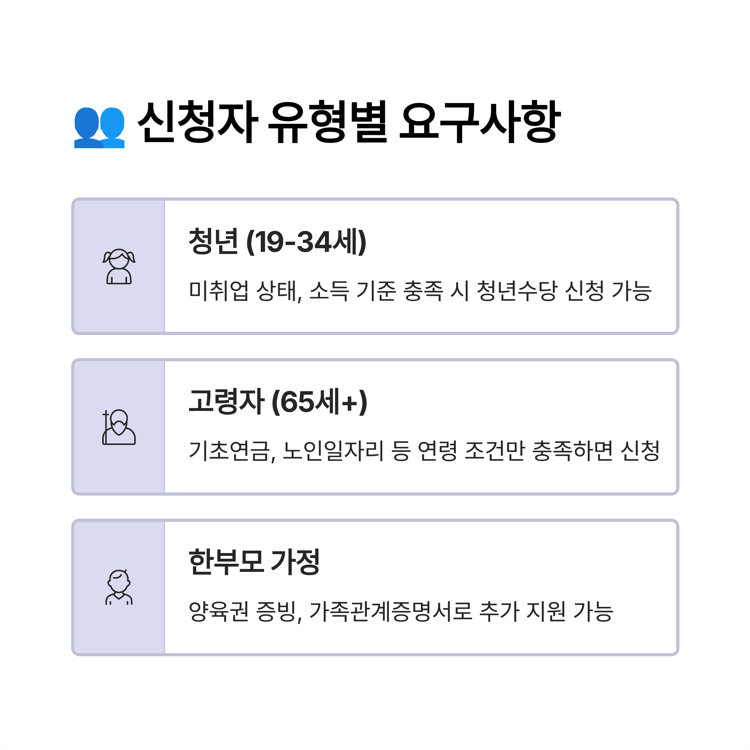 복지나 지원 제도는 ‘누가 신청하느냐’에 따라 요구하는 조건이 크게 달라져요. 즉, 청년인지, 노인인지, 실업자인지, 자영업자인지에 따라 준비해야 할 서류도 다르고 자격 기준도 달라진답니다. 이 파트에서는 신청자 유형별로 필요한 항목을 깔끔하게 정리해드릴게요! 📌