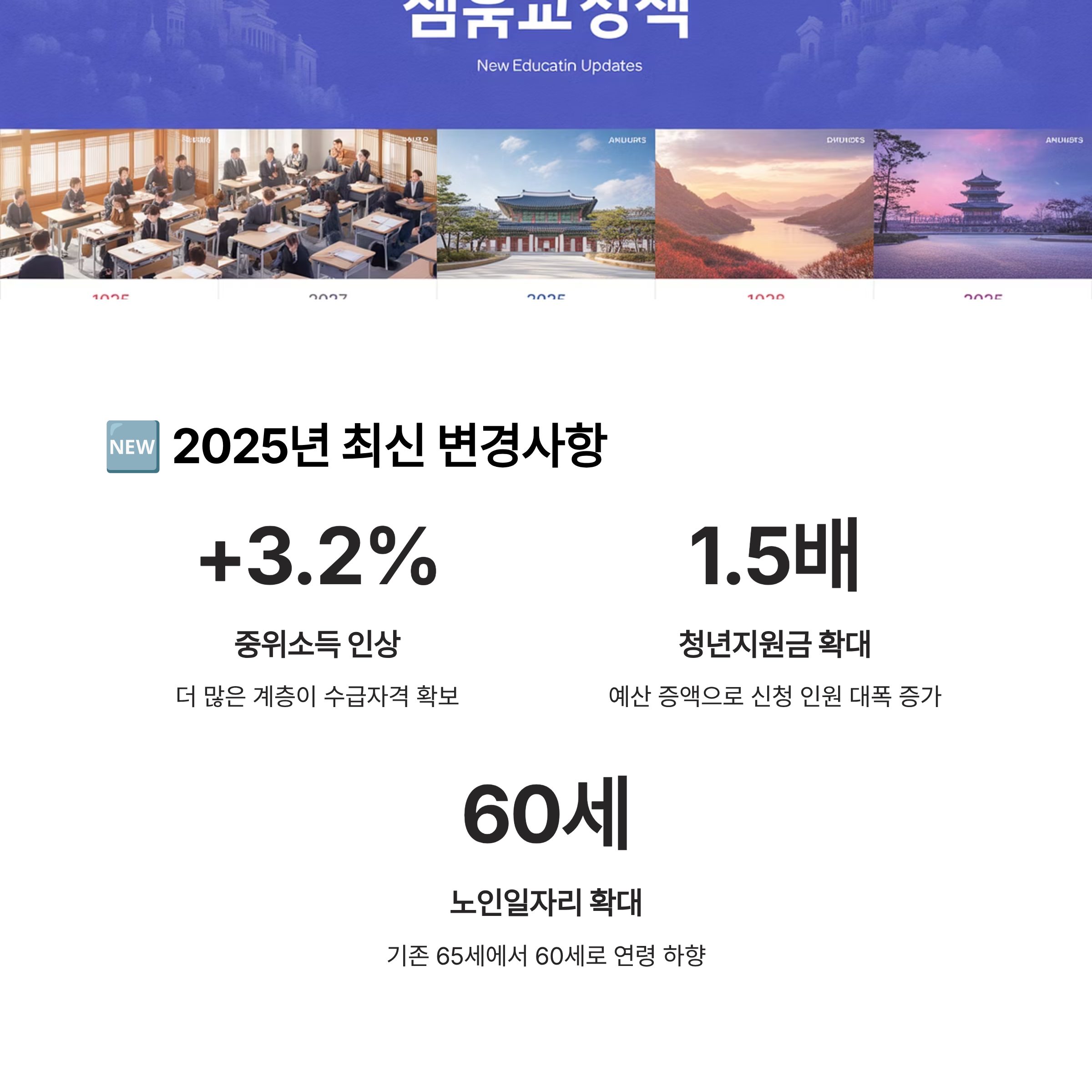 3️⃣ 노인 일자리 조건 완화: 65세 이상만 가능했던 노인일자리 사업이, 올해는 60세 이상 일부 저소득층에게도 확대 적용되고 있어요. 또한 디지털 기기 보조 교육 등 새로운 일자리 프로그램이 추가되어 선택의 폭이 넓어졌어요.
