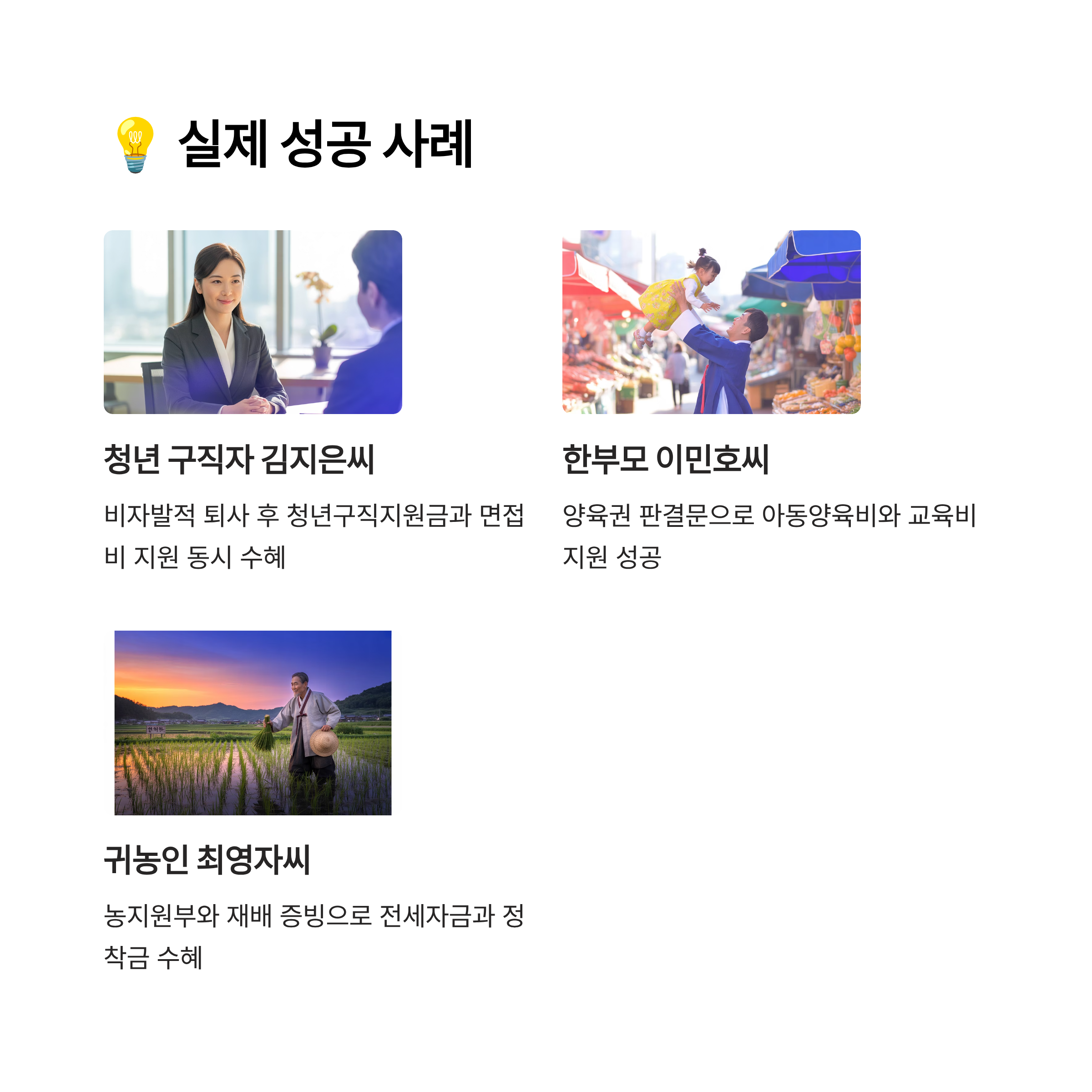 이렇게 실제 사례를 통해 보면 나와 비슷한 상황에 맞는 지원을 더 쉽게 찾을 수 있어요. 조건 충족이 어렵게만 느껴졌다면, 사례를 참고해서 자신도 가능성을 확인해보세요! 😃