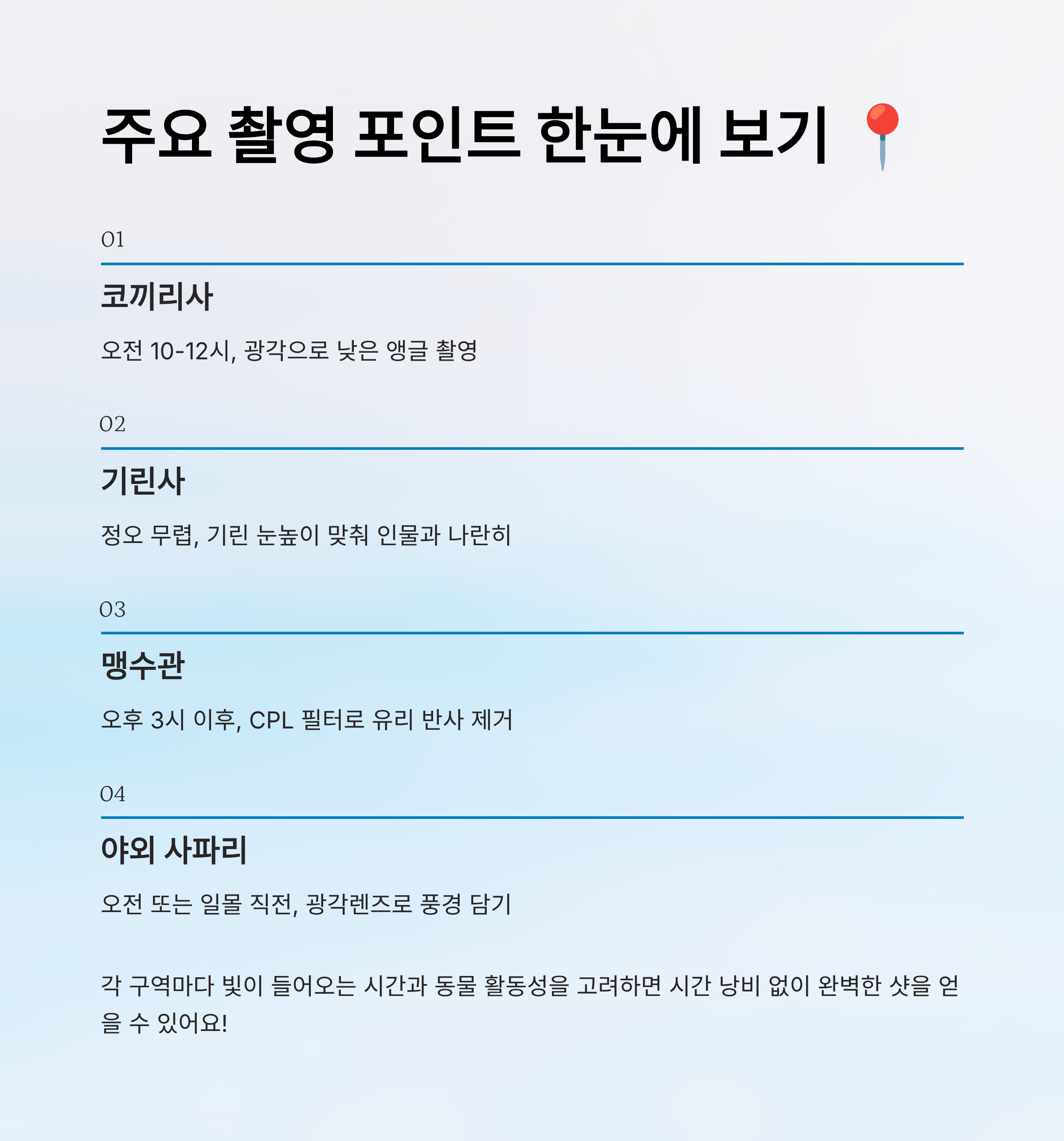 | 장소 | 특징 | 추천 시간 | 촬영 팁 |