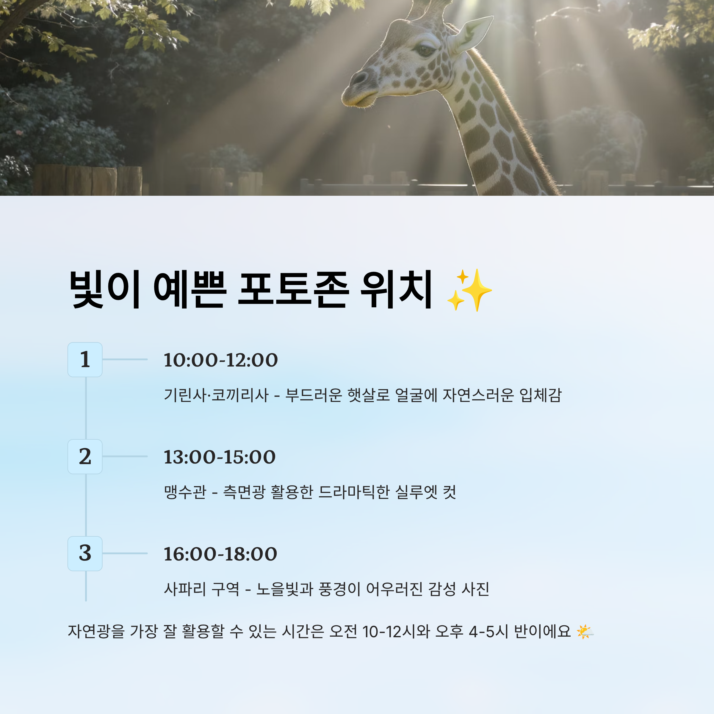 각 구역마다 빛이 들어오는 시간과 위치가 다르기 때문에, 위 표를 참고해서 움직이면 시간 낭비 없이 인생샷을 얻을 수 있어요. 특히 동물들의 활동성이 높은 시간대를 고려하면 생동감 있는 컷도 노릴 수 있답니다 🐾