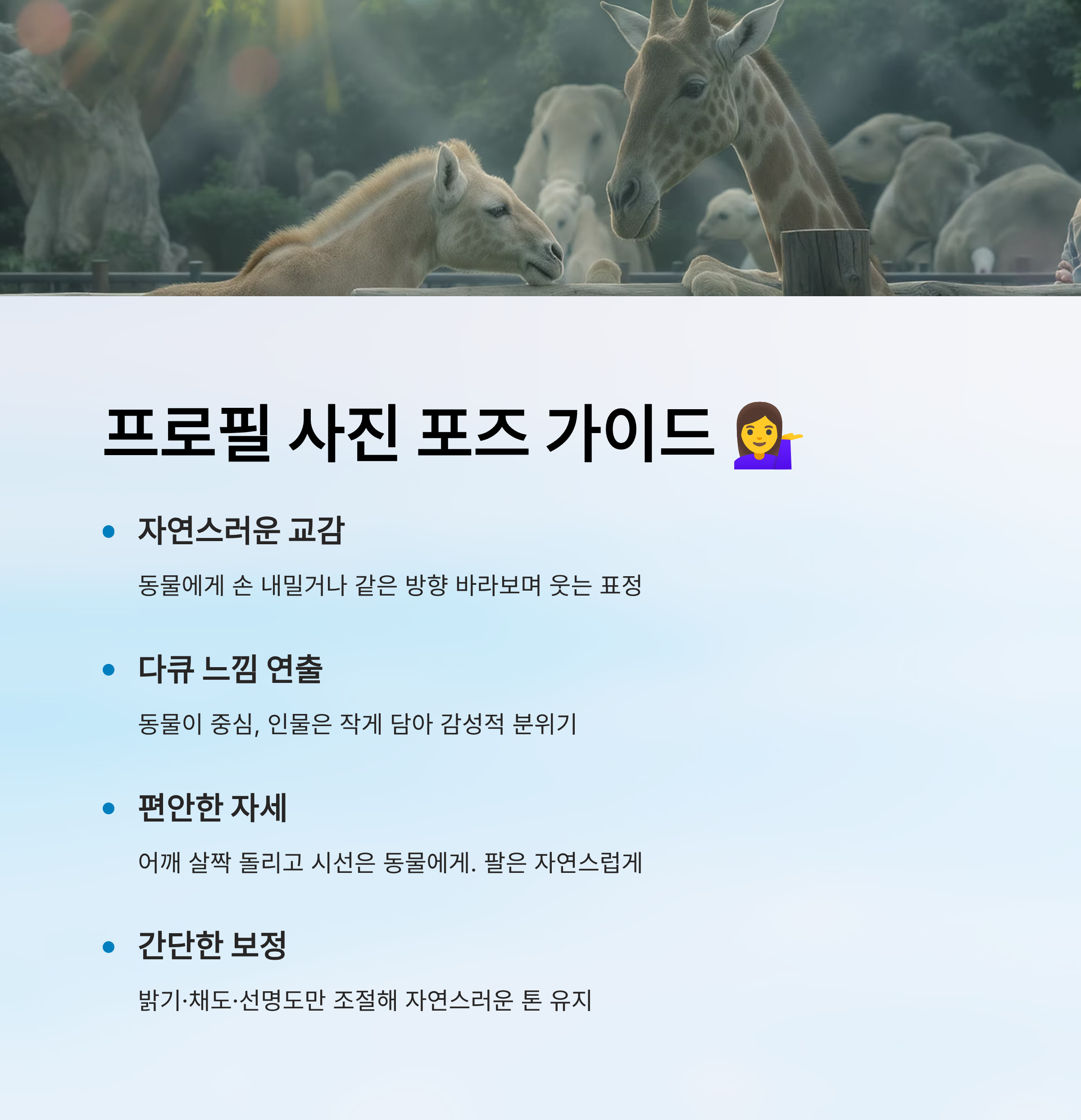 사람이 아닌 동물이 주인공인 듯한 사진도 좋아요. 예를 들어 동물이 중심이고 인물은 옆에서 작게 담기면, 마치 다큐멘터리 속 한 장면 같은 분위기를 낼 수 있어요. 이때 인물은 부드러운 표정, 혹은 ‘무표정+살짝 미소’ 정도면 충분히 감성적인 느낌을 줄 수 있어요.