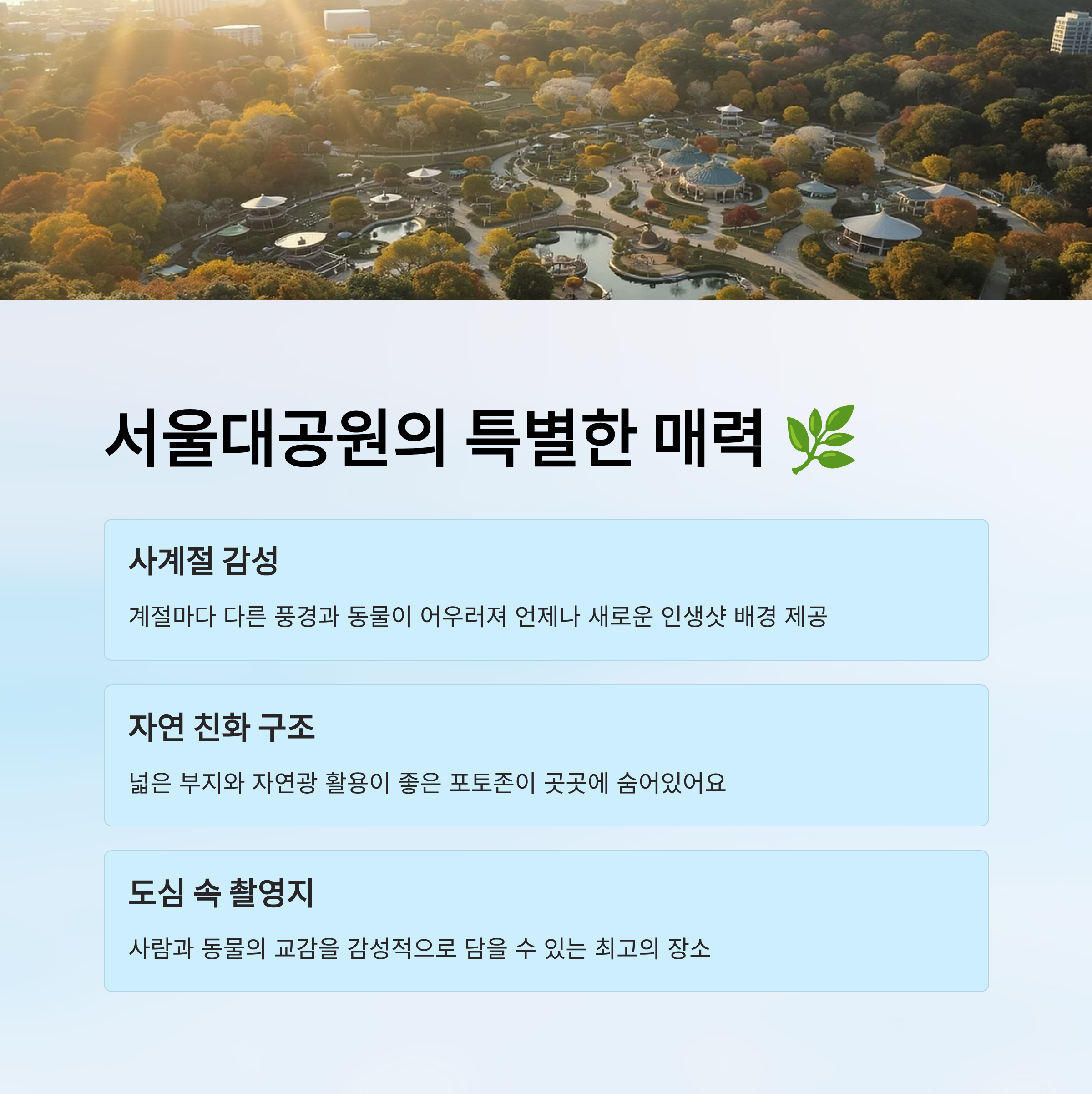 제가 생각했을 때, 서울대공원 동물원은 단순히 동물을 관찰하는 공간이 아니라, 사람과 동물이 함께 있는 장면을 감성적으로 담아낼 수 있는 도심 속 최고의 촬영지예요. 특히 요즘처럼 감성 있는 인스타용 사진을 원한다면, 이곳만한 곳이 없죠!