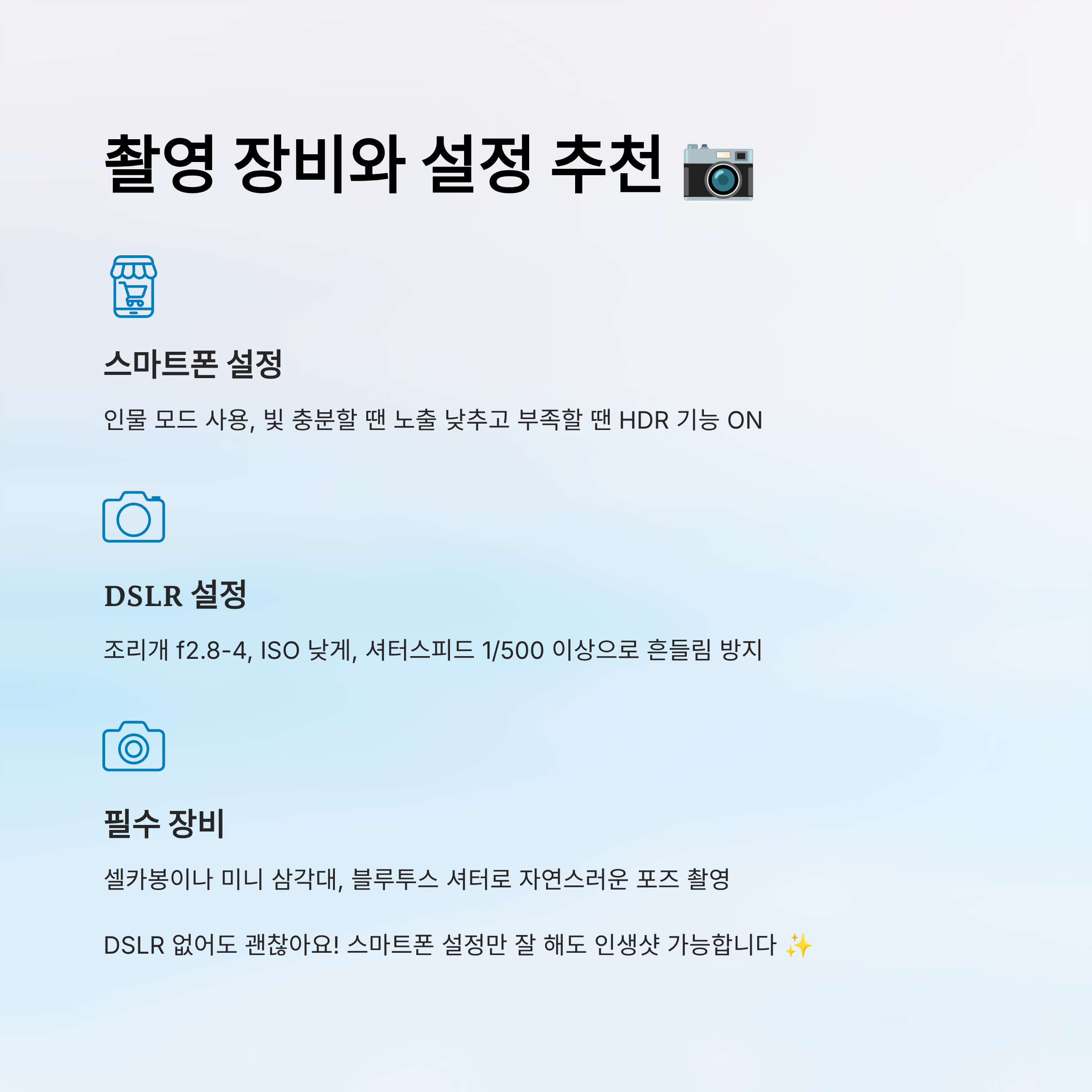 촬영 장비와 설정 추천📷
