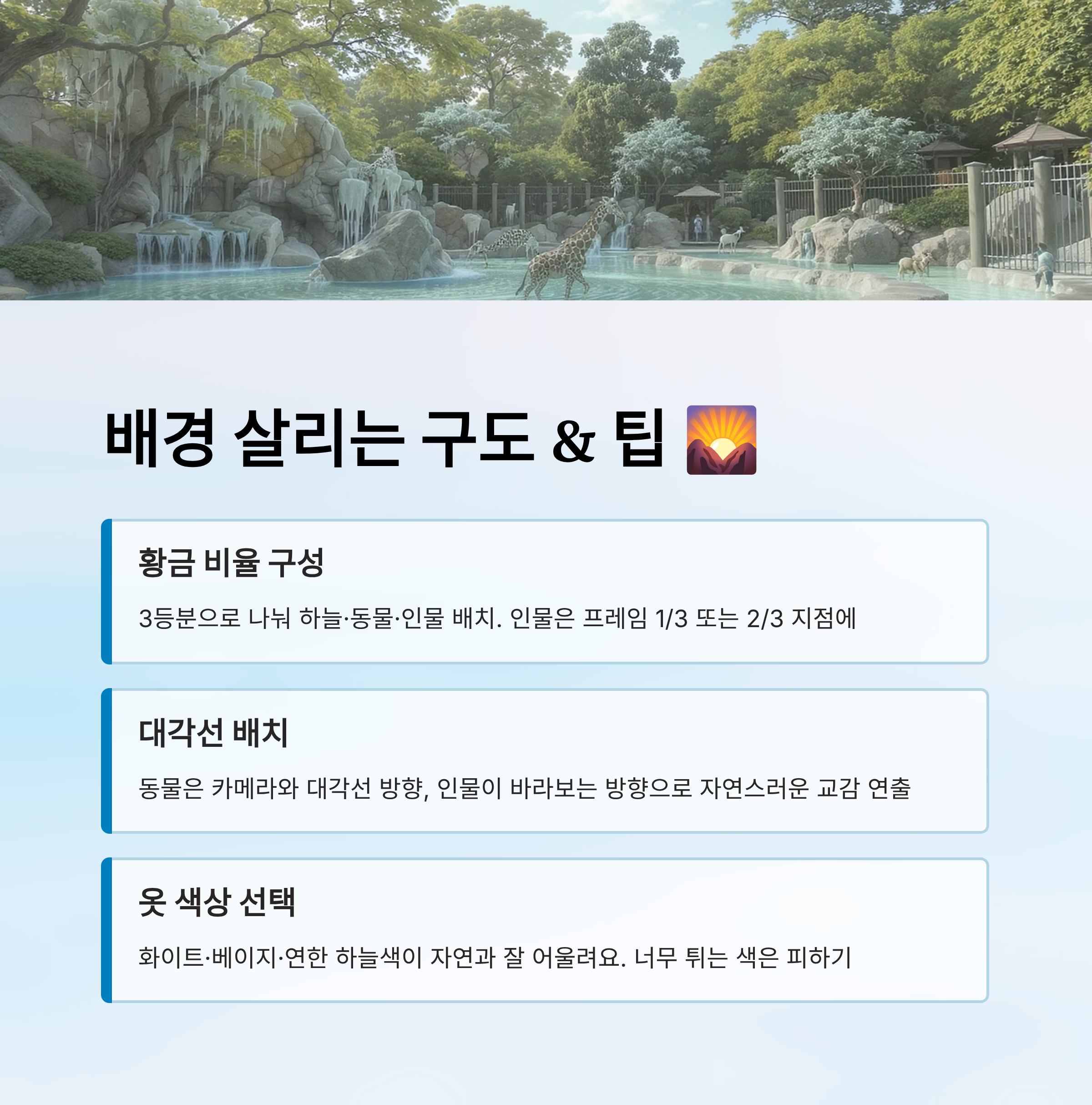 또한 배경과 인물이 색이 겹치지 않도록 옷 색도 고려하면 좋아요. 동물원에서는 화이트, 베이지, 연한 하늘색 옷이 자연과 잘 어울리고, 사진 속에서 돋보일 수 있어요. 너무 튀는 색은 배경보다 인물만 부각시켜 감성 분위기를 해칠 수 있답니다🎨