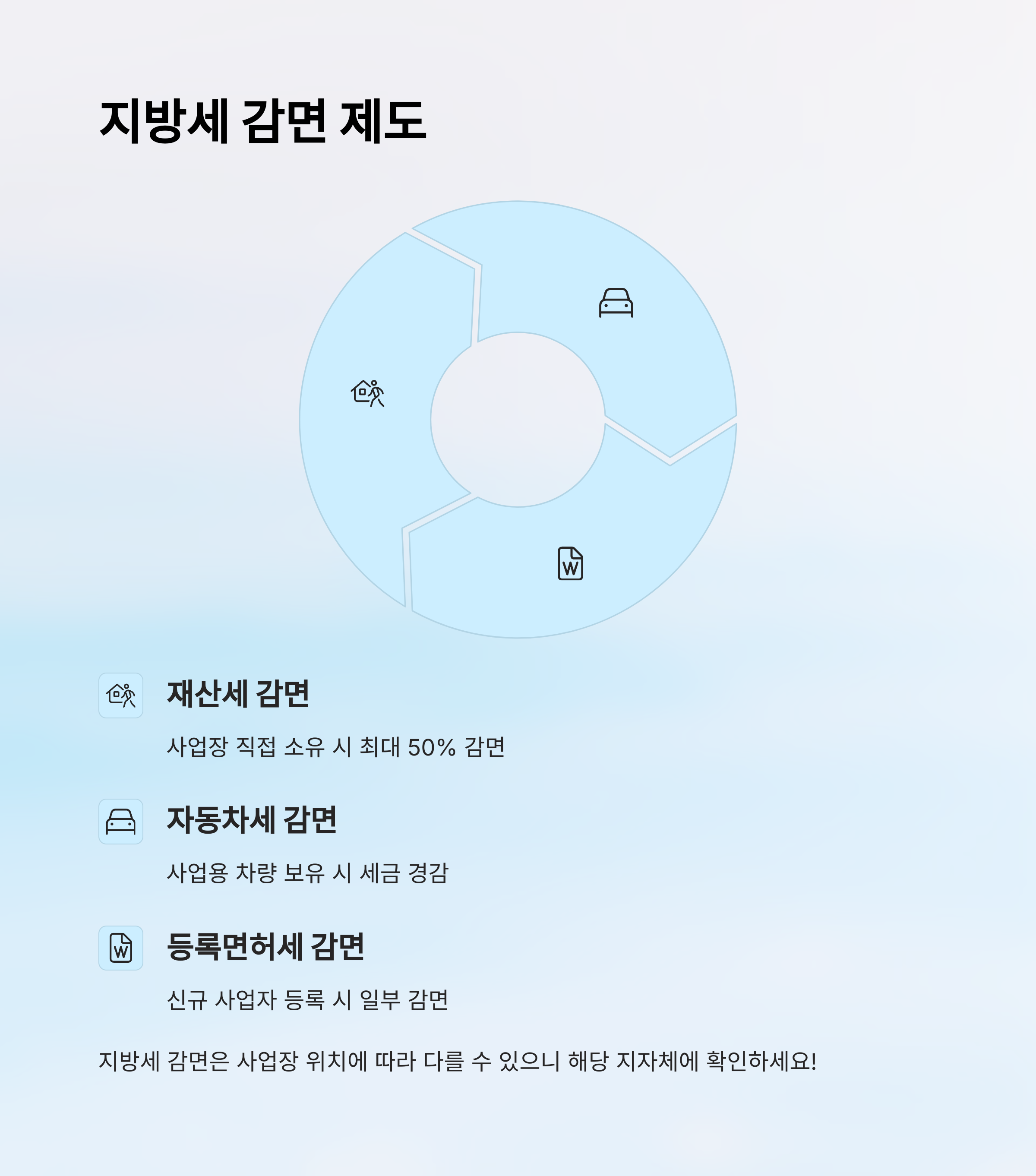 | 재산세 감면 | 사업장 직접 소유 사업자 | 최대 50% 감면 |