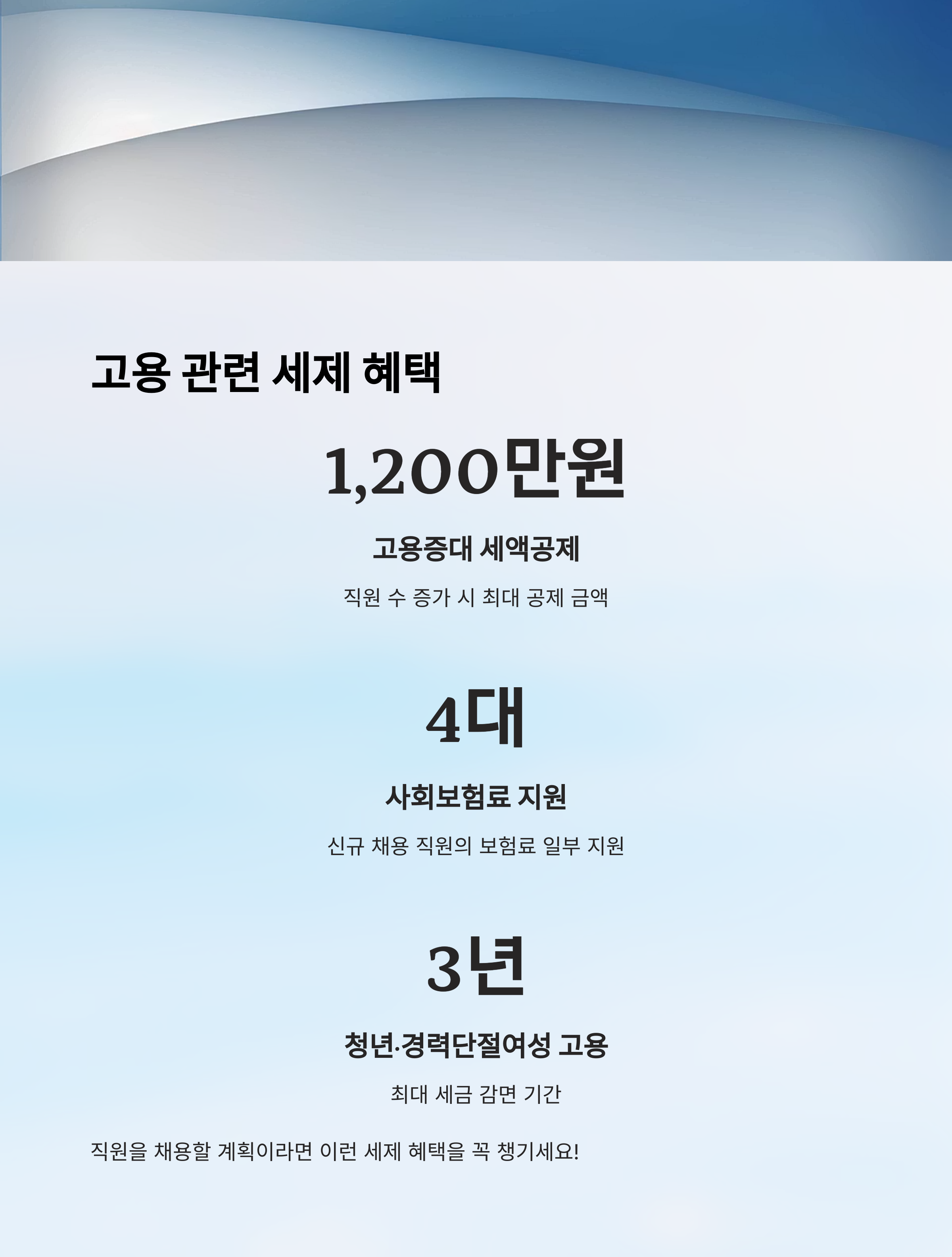 ✅ 고용증대 세액공제: 직원 수를 늘리면 최대 1,200만 원까지 세금 공제를 받을 수 있어요.