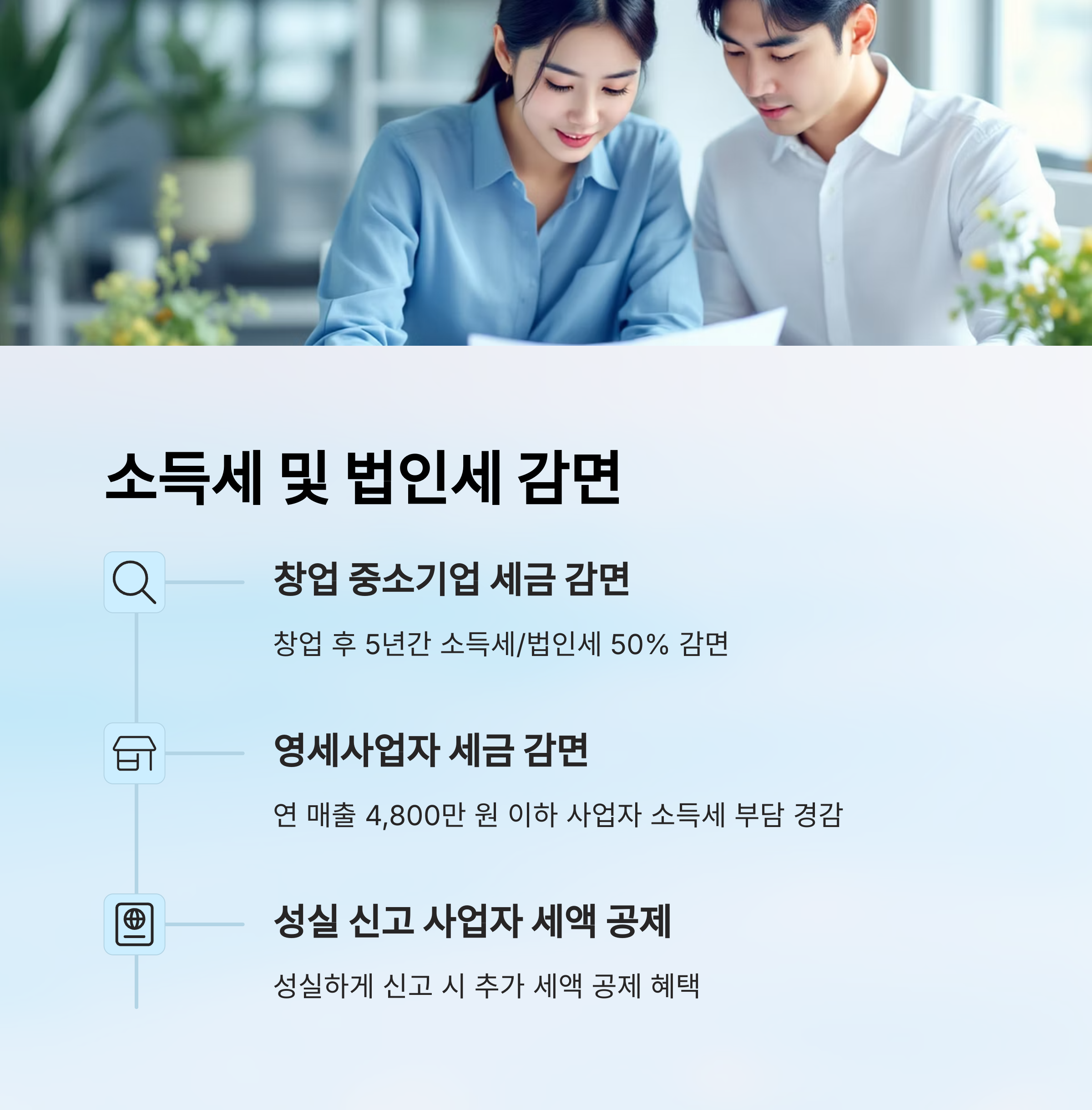 | 창업 중소기업 세액 감면 | 창업 후 5년 이내 사업자 | 소득세·법인세 50~100% 감면 |