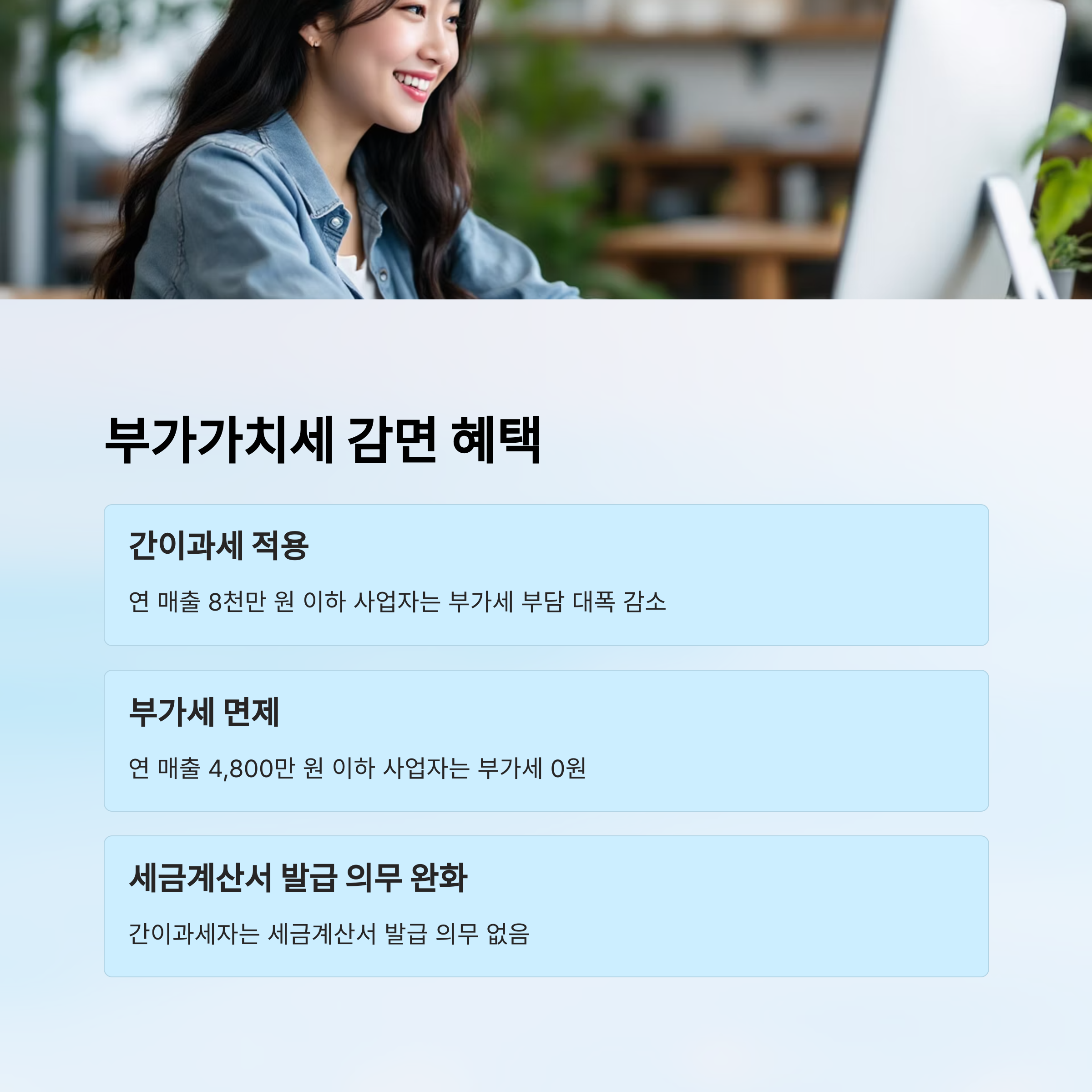 ✅ 부가세 면제: 연 매출 4,800만 원 이하 사업자는 아예 부가세를 내지 않아도 돼요.
