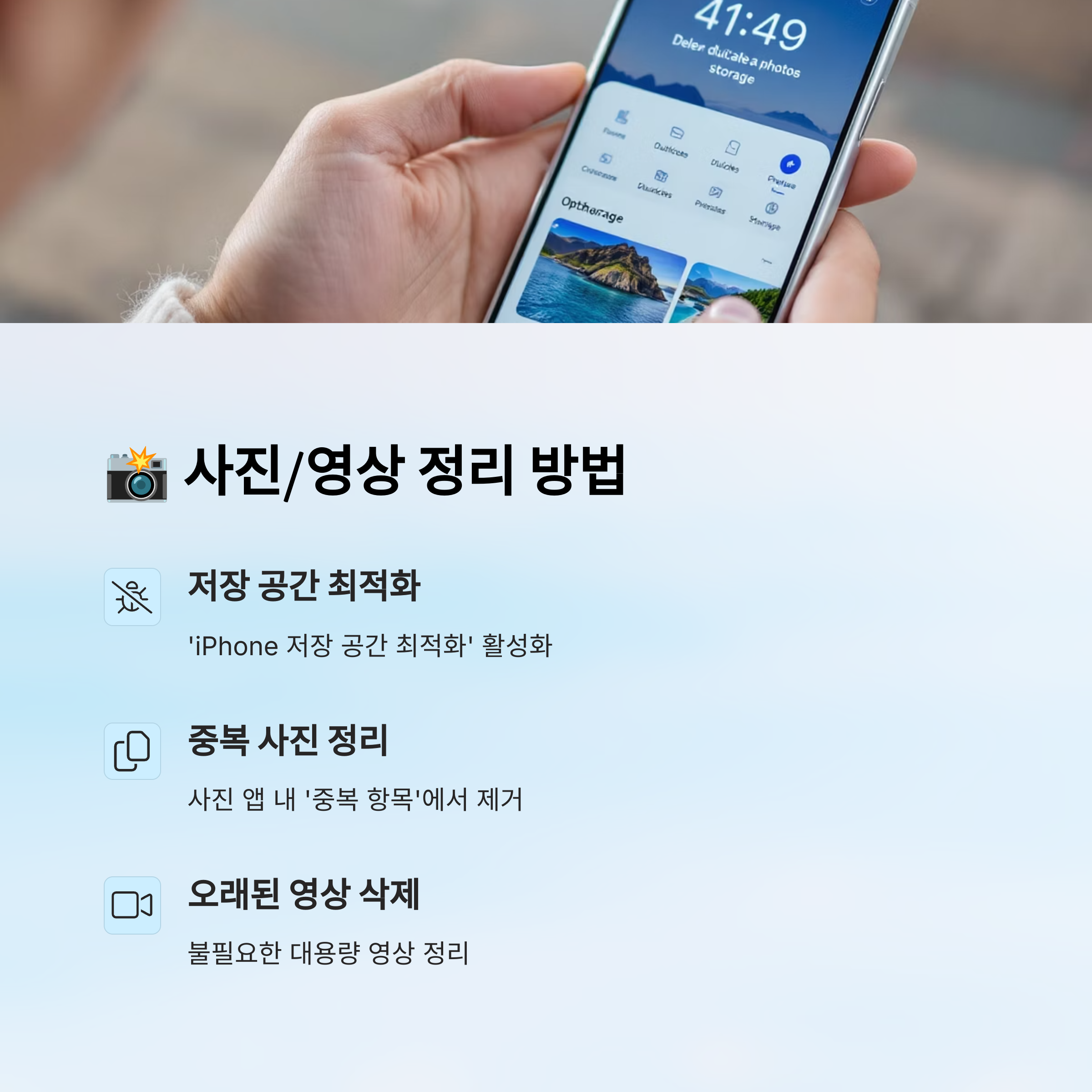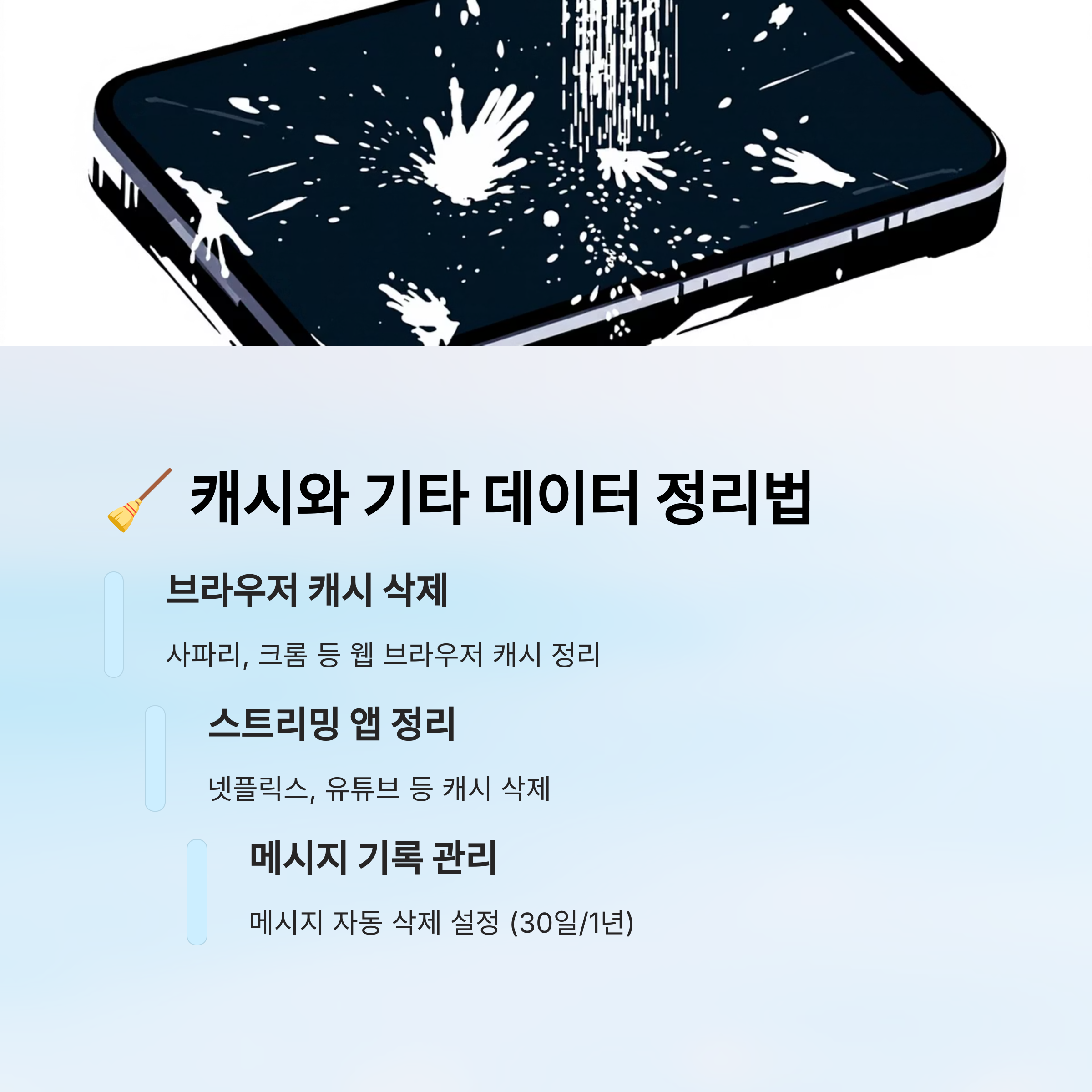 🧹 앱 데이터 최적화: 설정 > iCloud > 저장공간 관리 > 앱 선택 후 정리